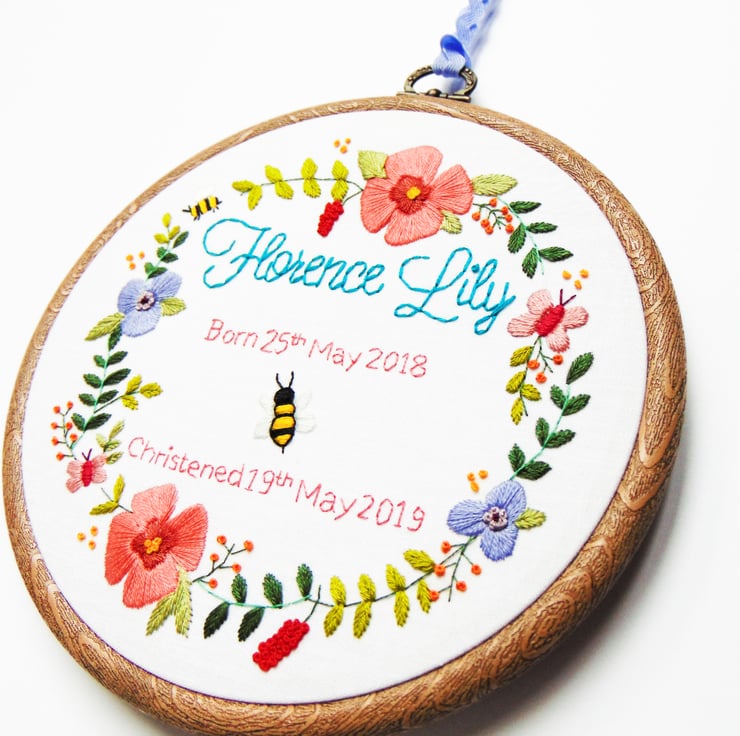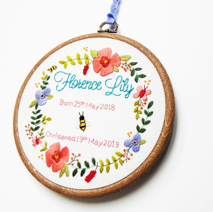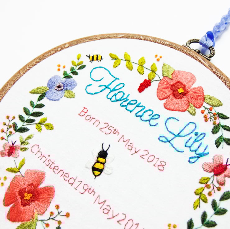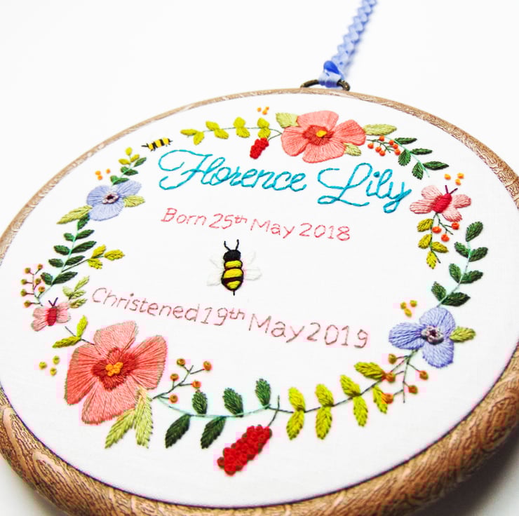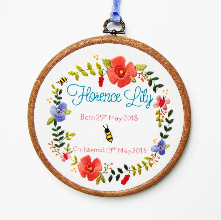 Looking for that extra special christening gift with the wow factor? My stunningly beautiful floral wreath hoop is the perfect choice. It features masses of greenery and flowers which are all hand stitched and can be personalised in the middle with any text of your choosing in any colour. Your finished embroidery will be hand sewn onto white cotton and set in a six inch hoop.