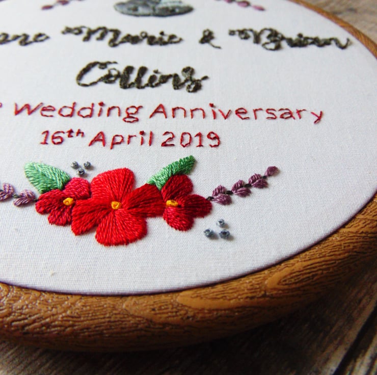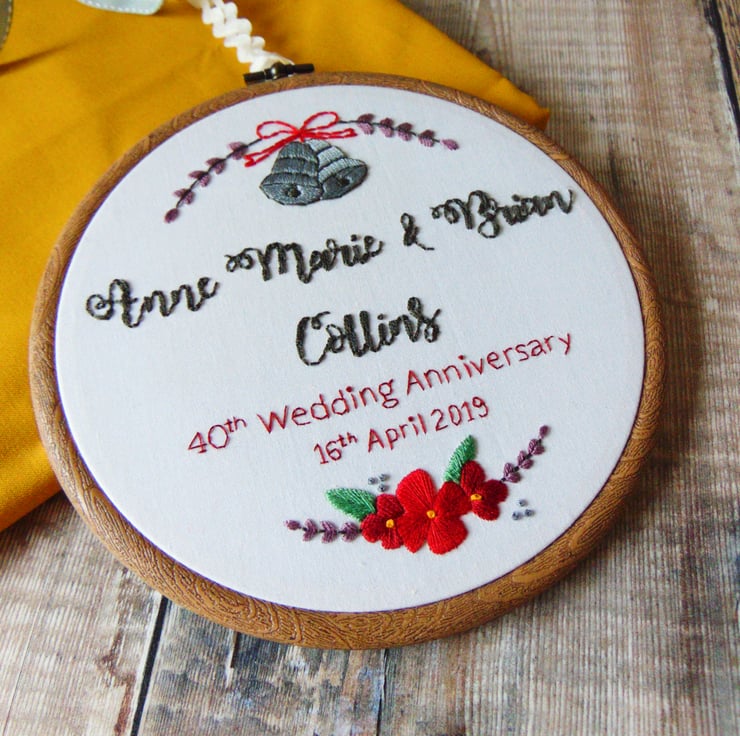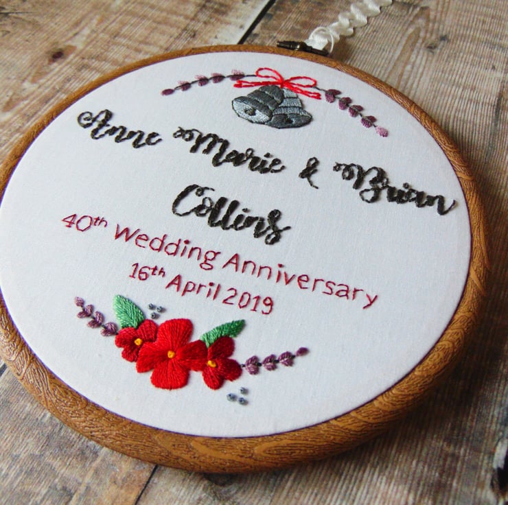This delightful bell and floral themed design is perfect either as a wedding or anniversary gift. It features two motifs, one at the top which has two bells and another which has flowers. I can stitch any wording in the middle such as names, date etc, in any colour and the entire made to order hoop is hand sewn onto white fabric and set in a six inch embroidery hoop.