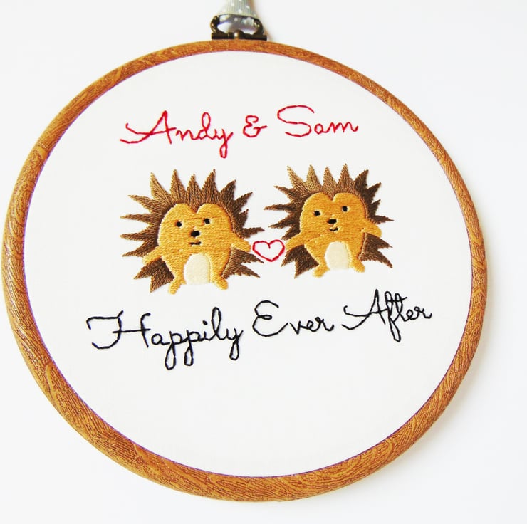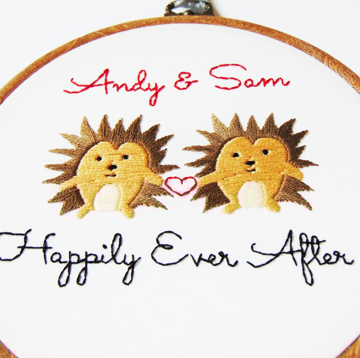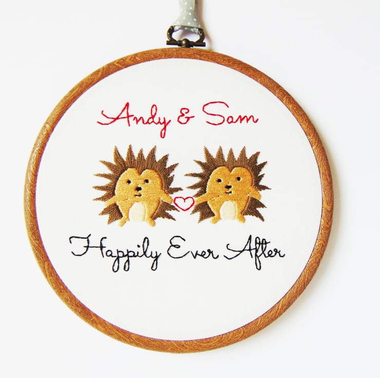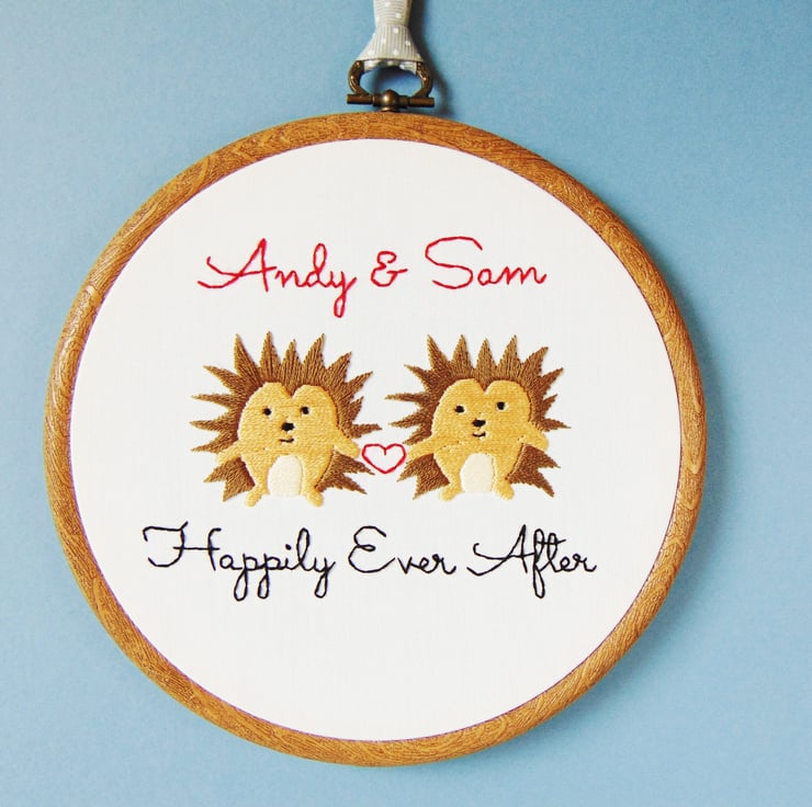This super cute hedgehog themed hand stitched hoop is the perfect personalised cotton anniversary gift. It features two heart-holding spiked hedgehogs, any personalisation you'd like and any colours. It is sewn onto white cotton and set in a six inch embroidery hoop.