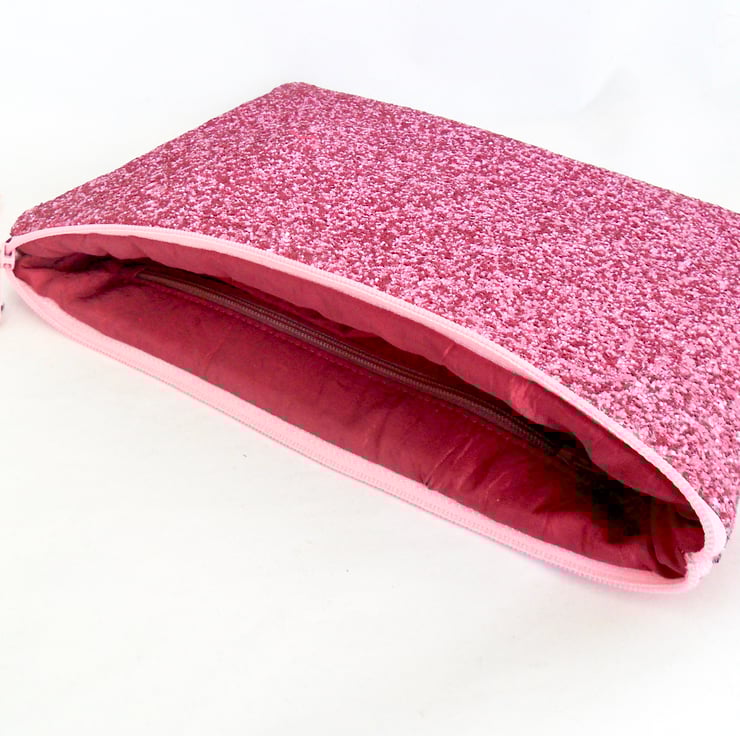 Handmade using a bright pink glitter fabric with a cotton backing, this clutch is perfect for a prom or party night. It's lined in a dusky pink crushed taffeta, and has both a slip pocket and a zipped pocket. The outer zip has a coordinating faux suede tassel trim. It's roomy and will carry everything you need for a fab night out!