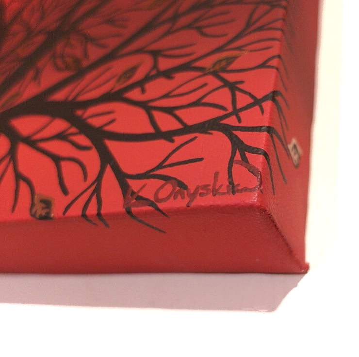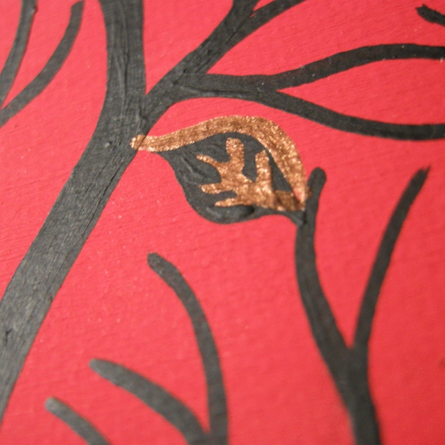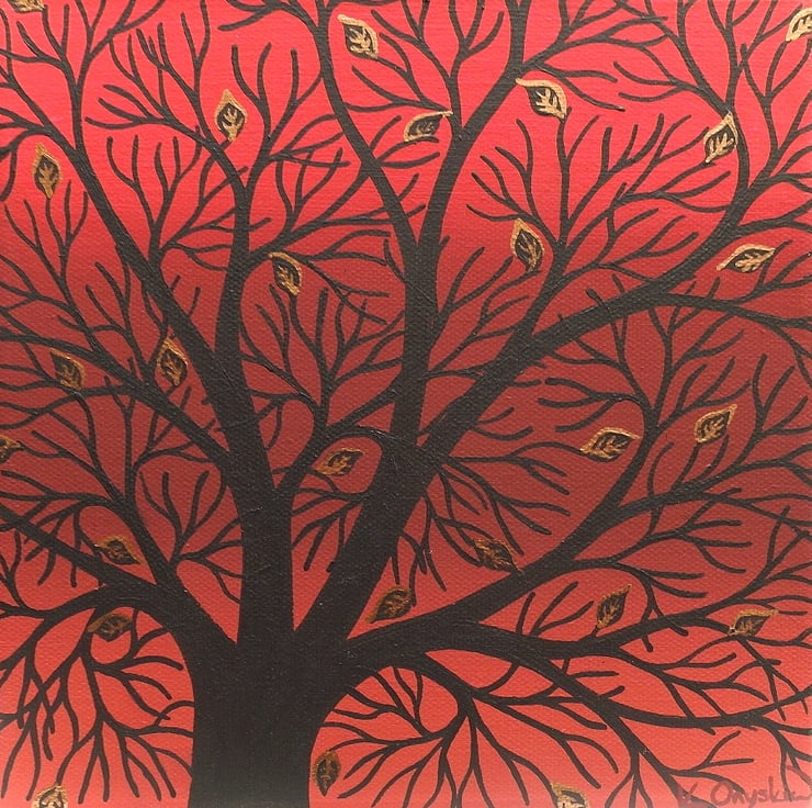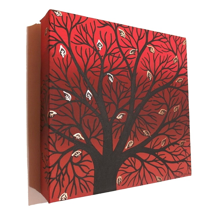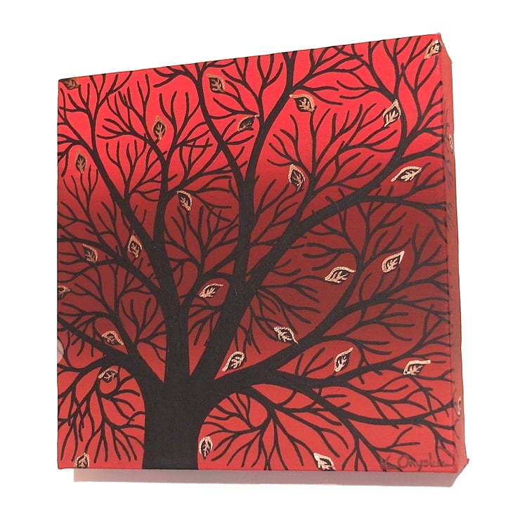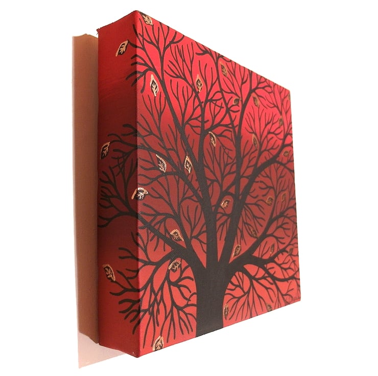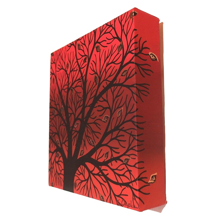This stylised tree art is painted in acrylics (with enamel for the copper), on a 20cm square canvas with 3.8cm deep edges (8" square with 1.5" edges) The image carries on over the edges of the canvas so there is no need for framing.