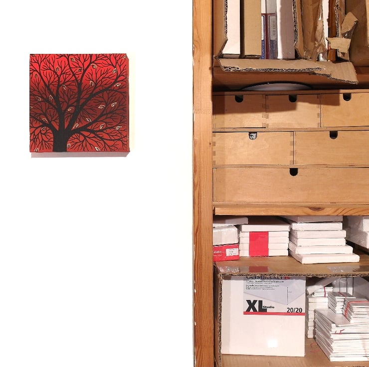 The red tree painting will be packaged with cardboard and bubblewrap to prevent any damage during shipping.