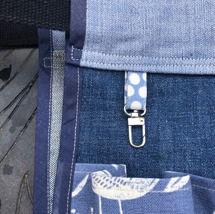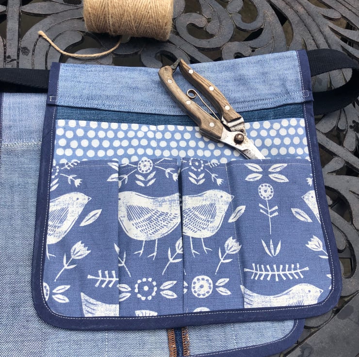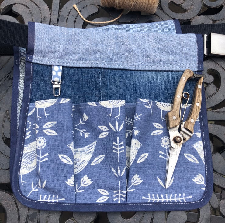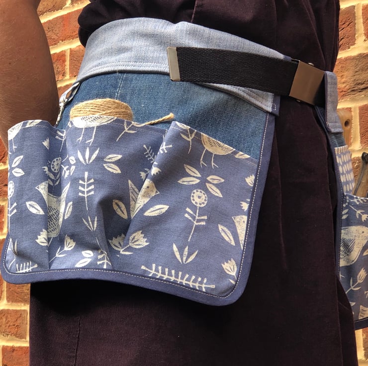 Garden tool belt made from recycled jeans. Two denim pouches slide on a salvaged webbing belt, so you can wear one or both or change the belt. As well as a base layer of denim, coordinating thick cottons are used for the pockets.