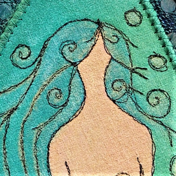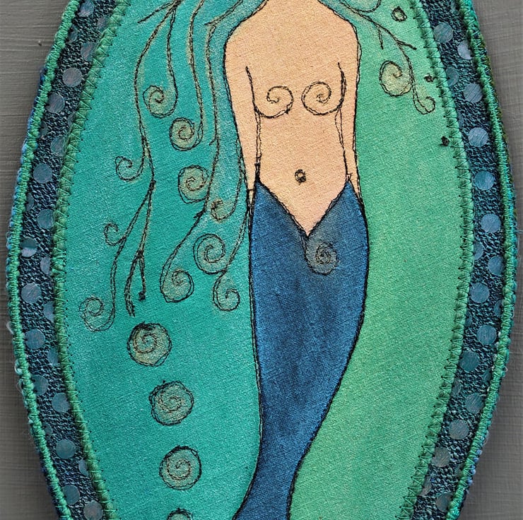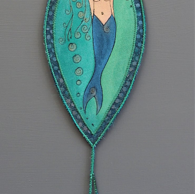 MAE001 - Mermaid Embroidery Wall Hanging - 15cm x 35cm (6"x10" approx) plus mixed, stitched yarn hanging loop, edging and tendrils with handmade painted, rolled paper beads. Overall length 83cm. Fabric painted shimmery Mermaid with black thread free motion/machine embroidery on an over-painted, pearlescent shimmer sequin fabric background. Pale jade colour stitching in rayon. Plain black fabric on the reverse. Stiffened to hold it's shape. Full view in second photo and the third a close up detail. Thank you Vicky x
