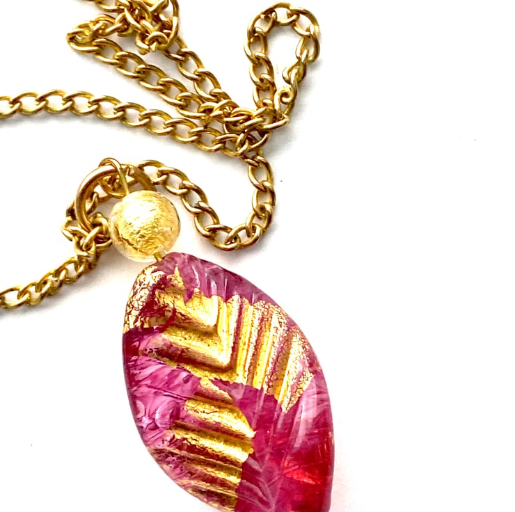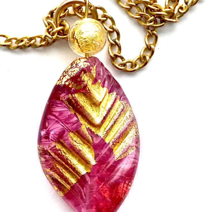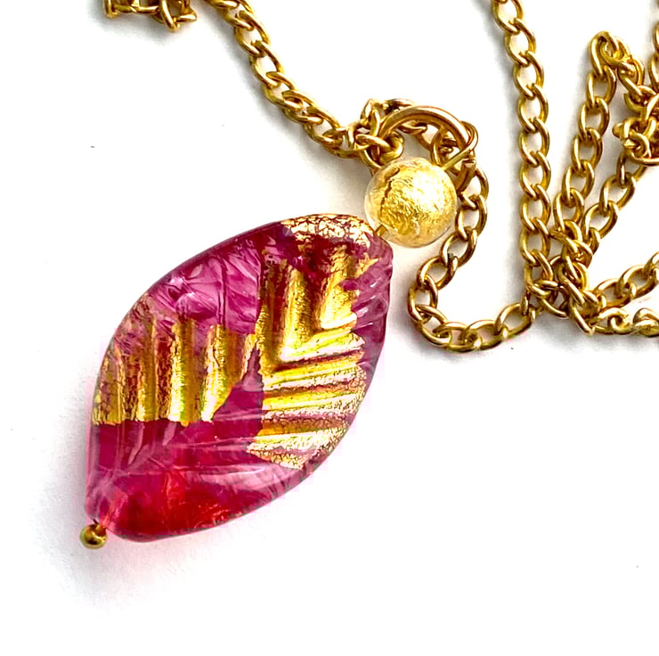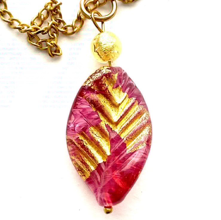A really pretty handmade Murano glass pendant with a glass 24k gold foiled ruby rose red elica twist leaf bead with a 24k gold foiled Murano glass round bead (40 x 20mm). Such a pretty colour. The pendant hangs from a gold plated chain (18ins) and is presented in a pretty gift pouch.