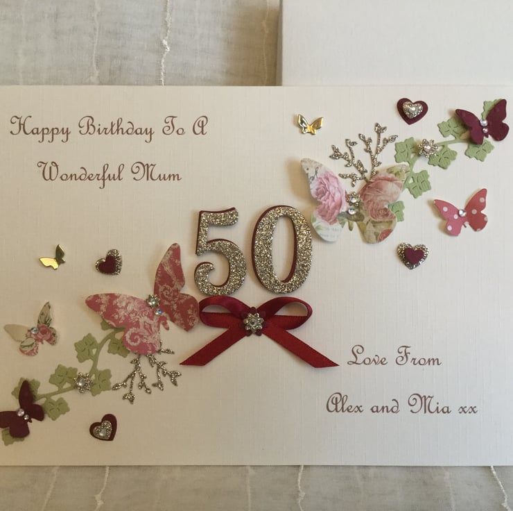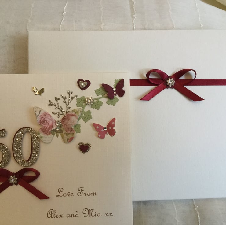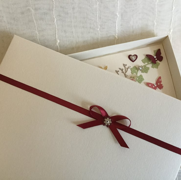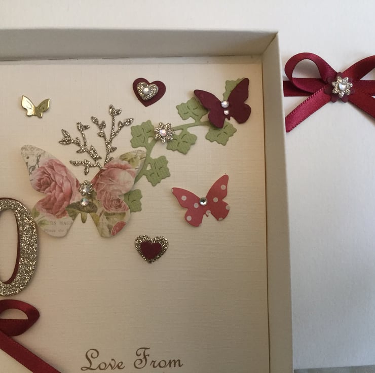 This handmade gift boxed card is A5 in size (210mm x 150mm) and can be personalised for any special birthday. It is on 300gsm cardstock and decorated with ribbons and gems. It comes in the matching decorated box and makes a wonderful keepsake.
