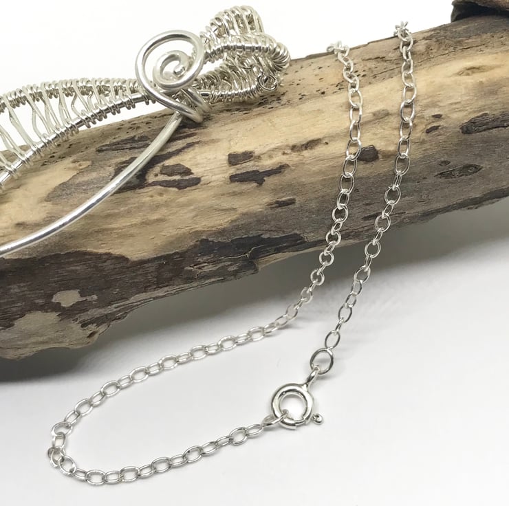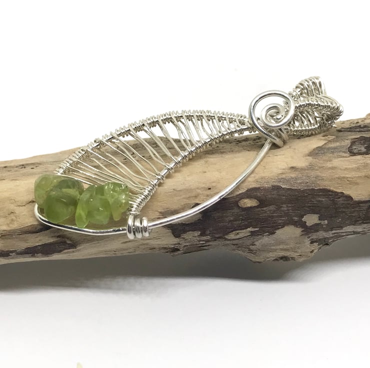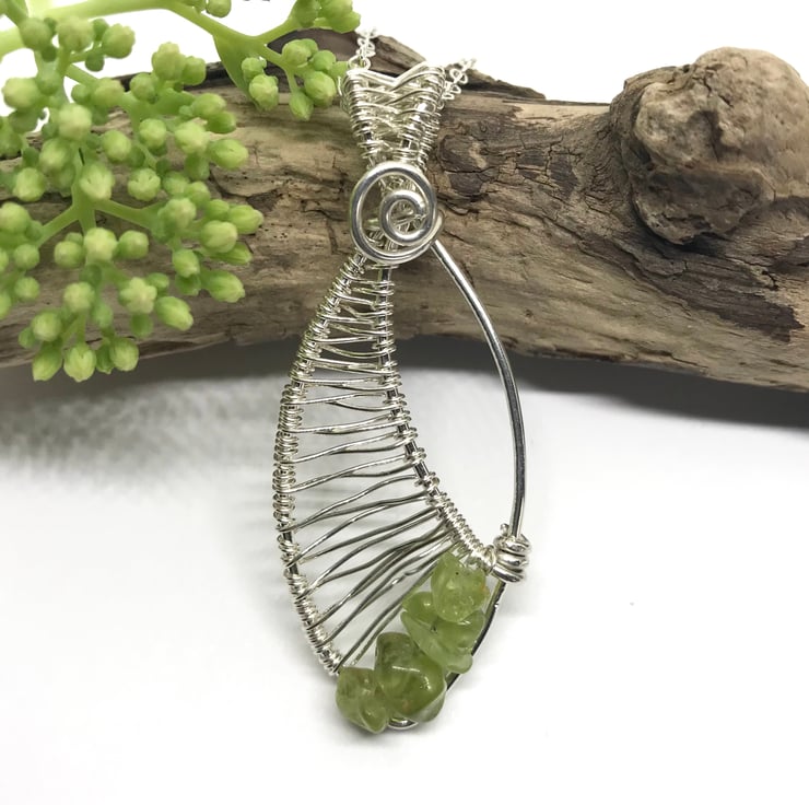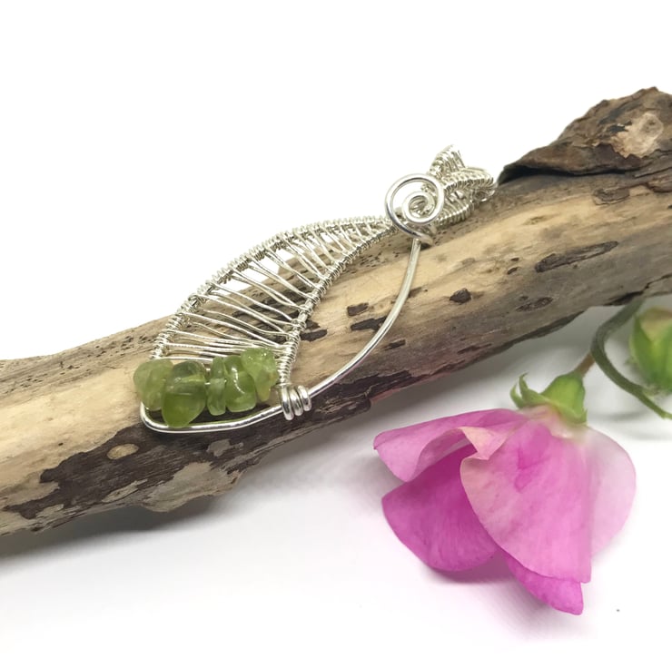 I have used wire wrapping and weaving techniques to make this pendant. A lovely Leaf shaped pendant, with a wire weave bail and an elegant swirl. The wire weave design is continued along the frame of the pendant using fine sterling silver wire and pretty peridot gemstone chip beads are added at the tip of the pendant. The pendant is completed with a sterling silver 18” chain.