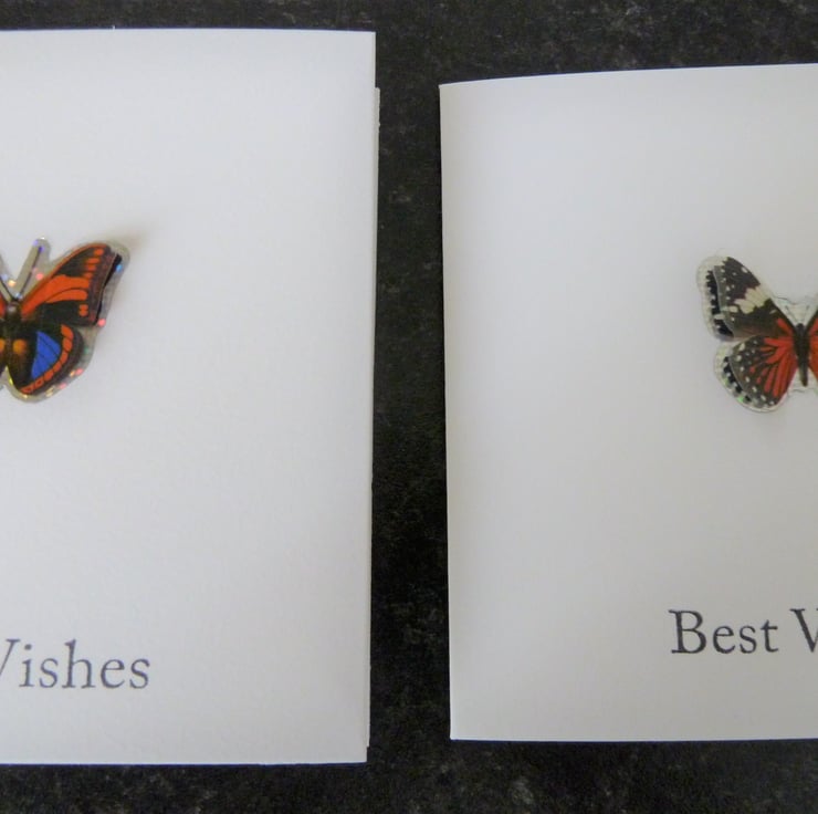 A set of 2 handmade cards which feature a 3D butterfly sticker, the words 'Best Wishes' have been hand stamped underneath.