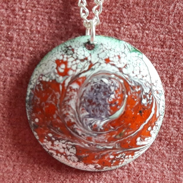 This pendant is based on a domed copper disc so I have attempted a different approach from my usual method of scrolled designs. After building a white background on the copper shape I have added a painted enamel design in purple and red. I have then drawn through the design when the disc was at red hot to generate a random, swirled pattern
