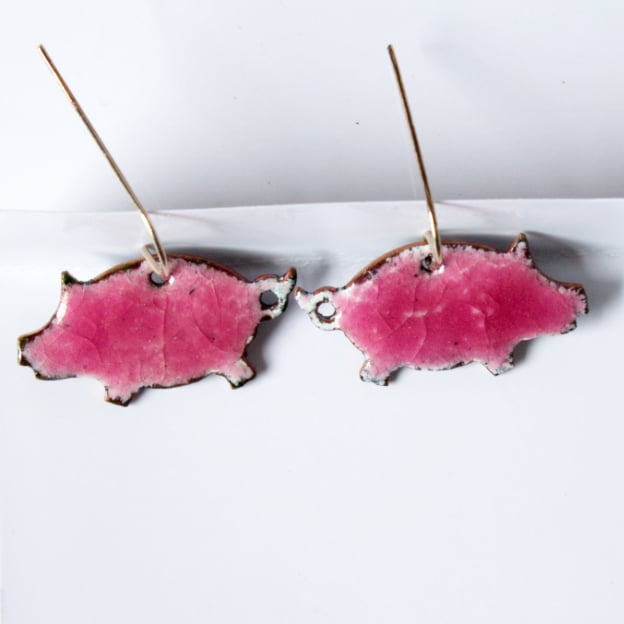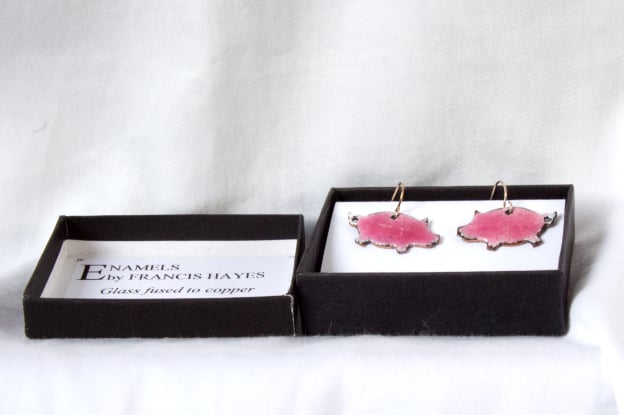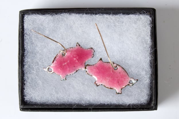 I have made these earrings by building up layers of white enamel on the copper shape then adding a layer of pink.