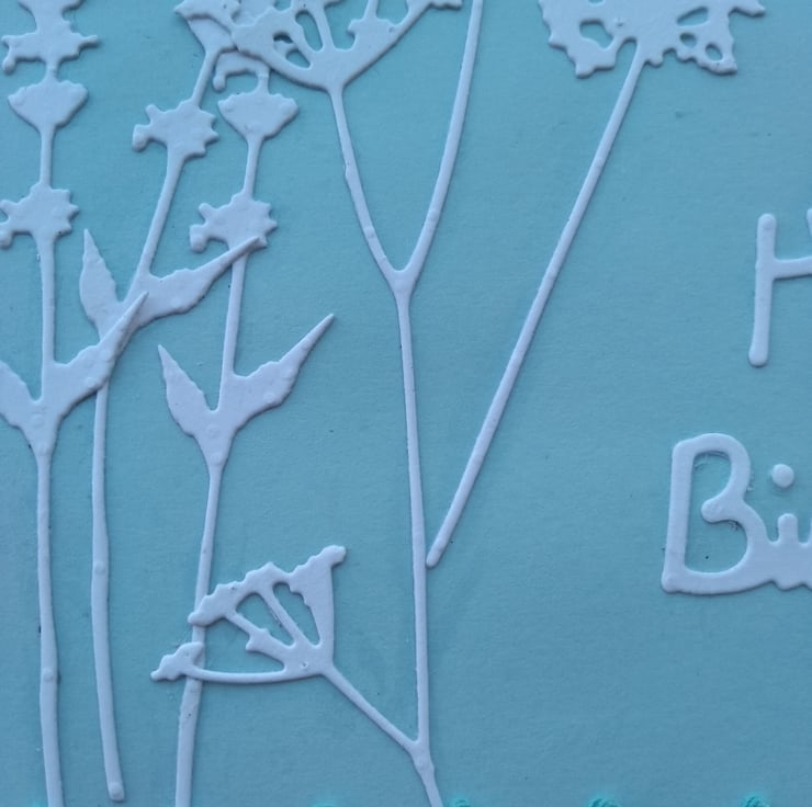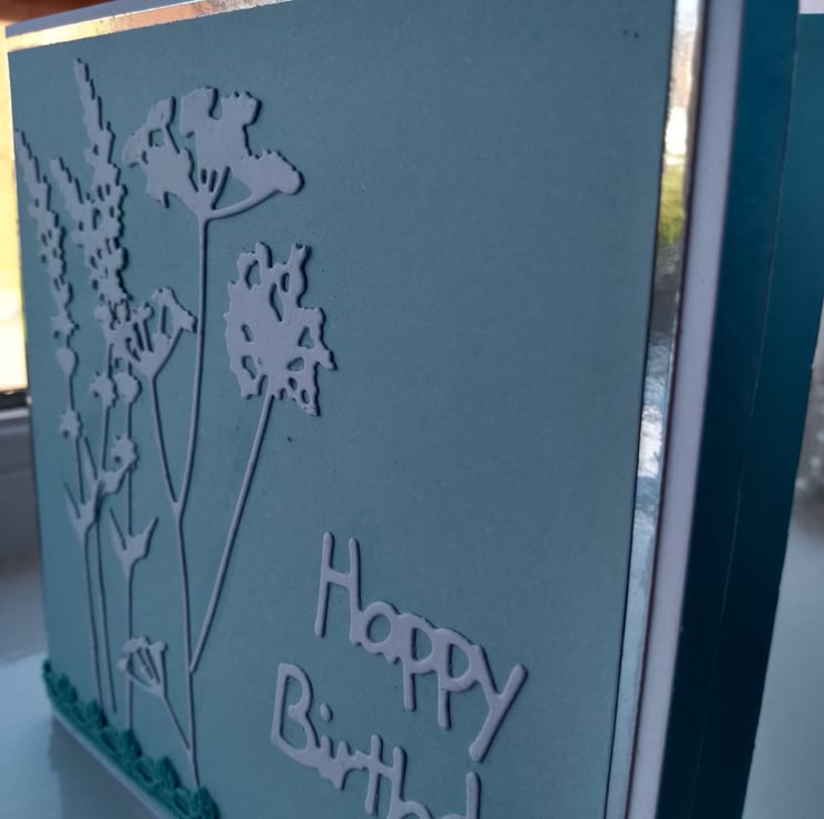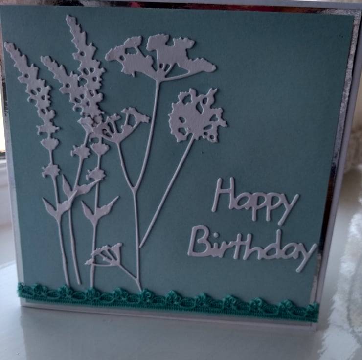 A completely handmade and uniquely designed card. Consisting of grasses and cow parsley die cut from white card mounted onto duck egg blue carf then silver mirri then onto quality pristine white card. Happy birthday added and finished off with co ordinating lacy ribbon
