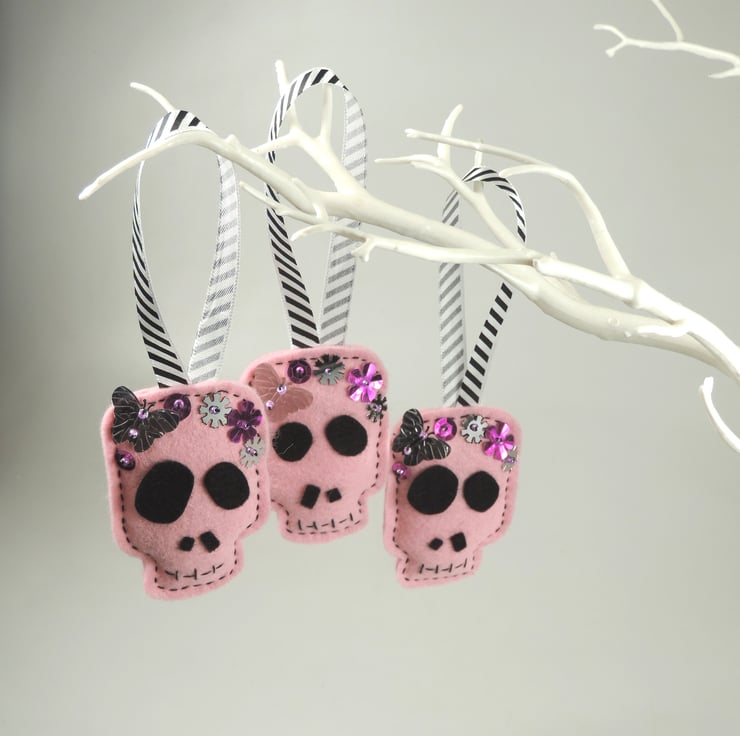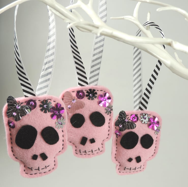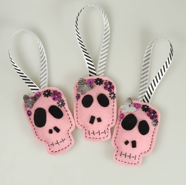 Set of three halloween, day of the dead themed felt decorations. matching pink stulls, decorated with sequins to form a garland across the forehead, felt eye and nose sockets, with stitched mouth detail.