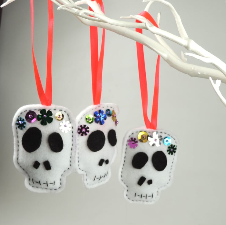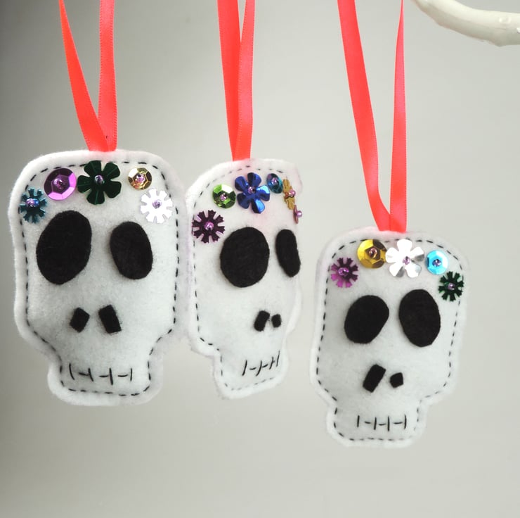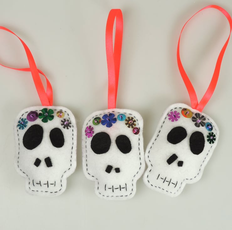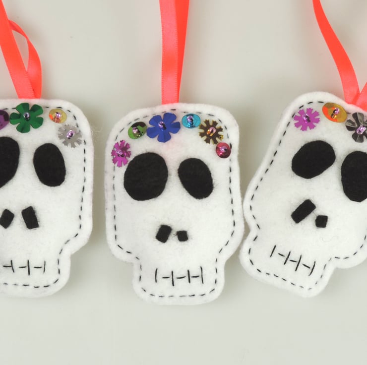 Set of three halloween, day of the dead themed felt decorations. matching white skulls, decorated with sequins to form a garland across the forehead, felt eye and nose sockets, with stitched mouth detail.