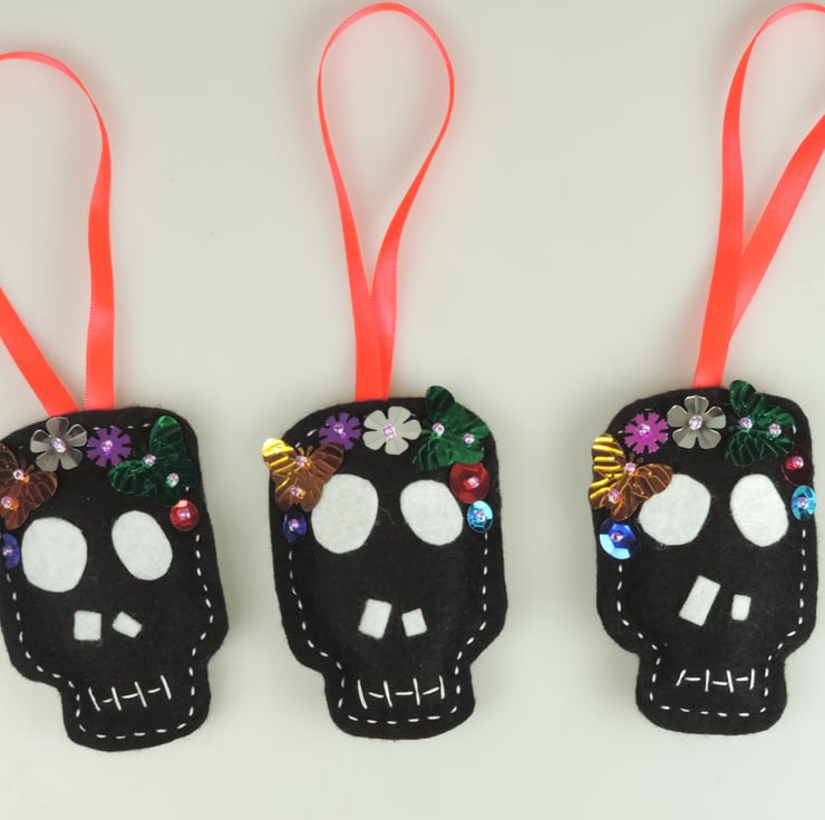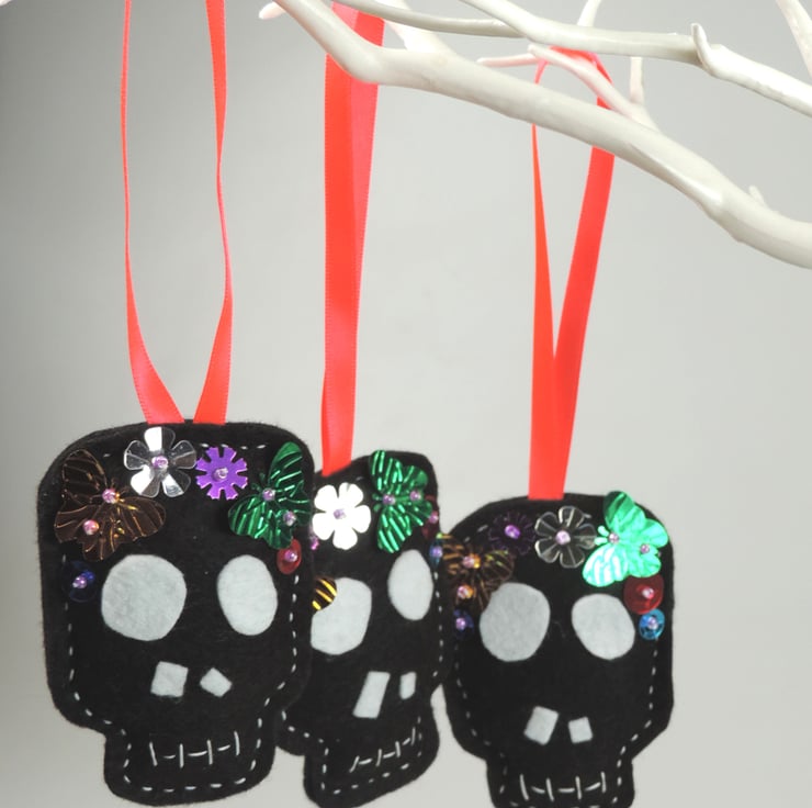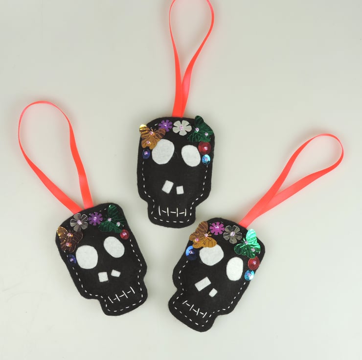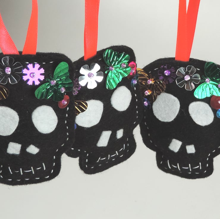 Set of three halloween, day of the dead themed felt decorations. matching black skulls, decorated with sequins to form a garland across the forehead, felt eye and nose sockets, with stitched mouth detail.