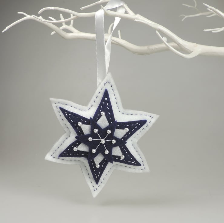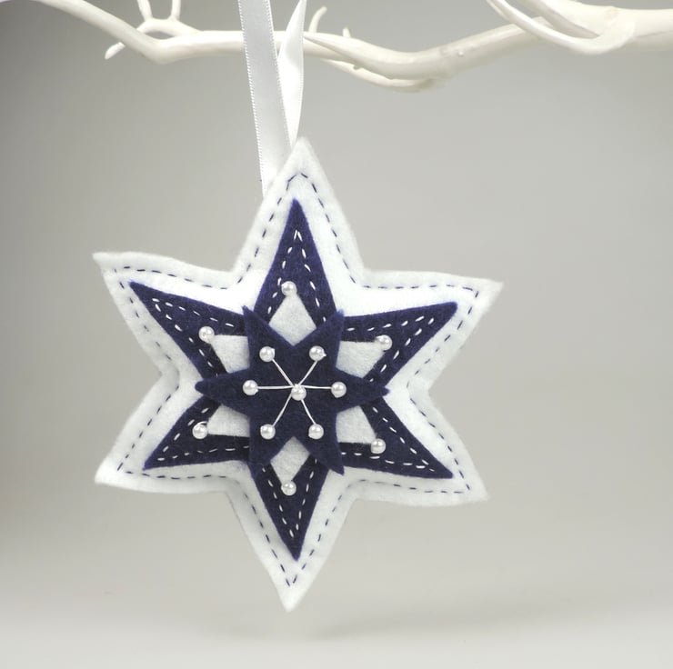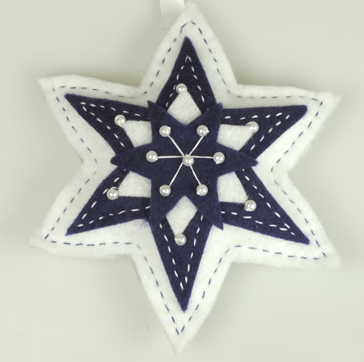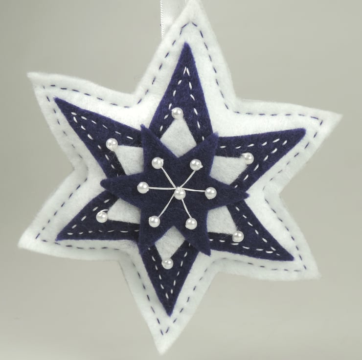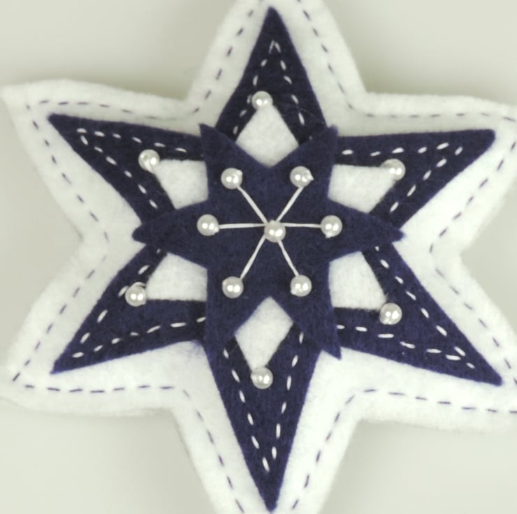 Large handmade felt star in white and navy blue, layered stars, with contrast stitching and simulated pearl beads.