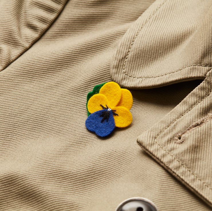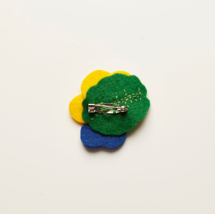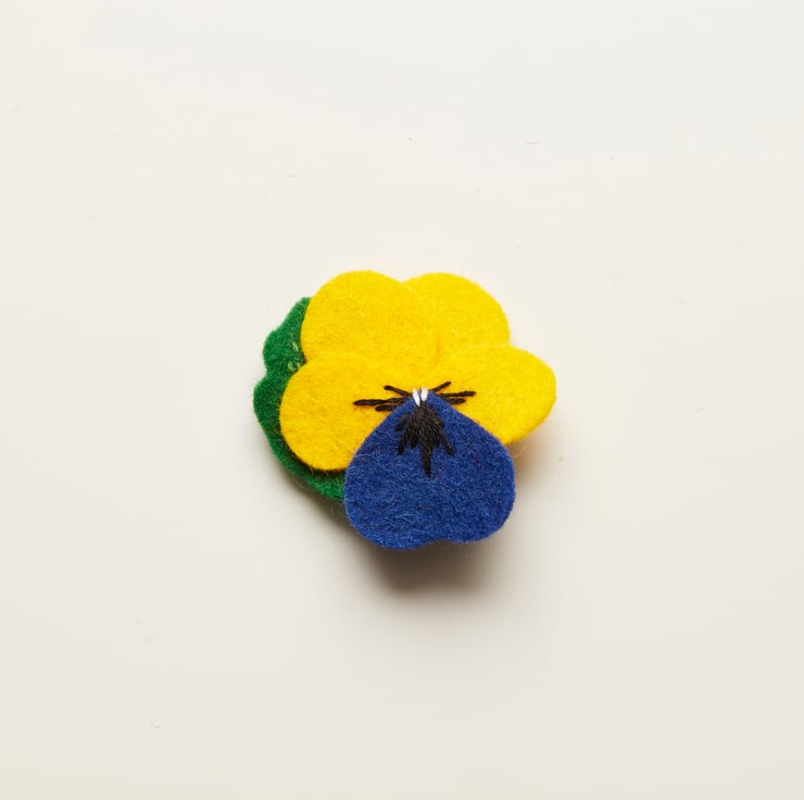 This little yellow and blue pansy brooch has been hand cut and hand sewn using 100% wool felt and embroidered in the centre. It has yellow and dark blue petals, a black centre and a single, embroidered green leaf behind. Perfect to add a pop of colour and style to wherever you choose to pin it!