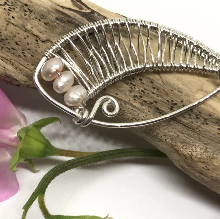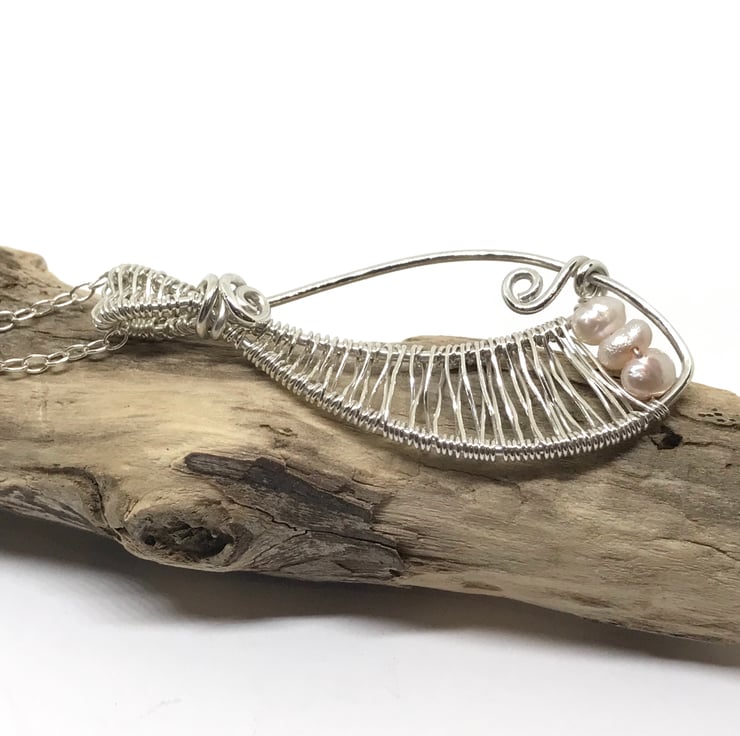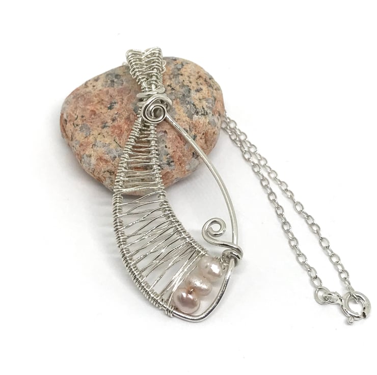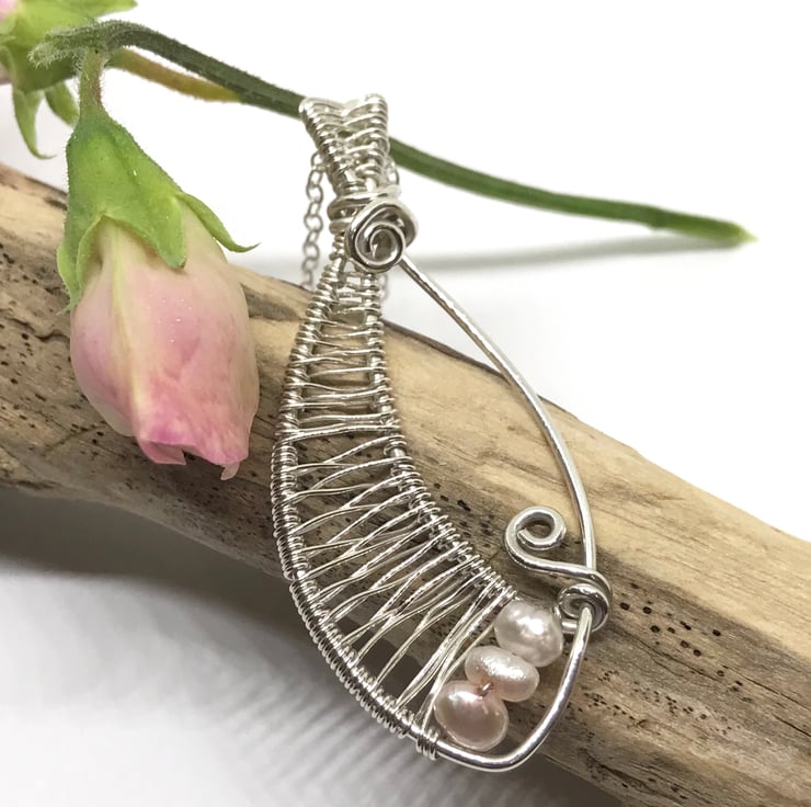 I have created this pretty pendant with sterling silver using wire wrapping and weaving techniques. I have formed the silver into an oval shape, created a bail with wire weaving and finishing with 2 silver swirls. The wire weaving is continued along one side of the oval with pretty freshwater pearls added at the base of the pendant. The pendant is completed with an 18” chain.