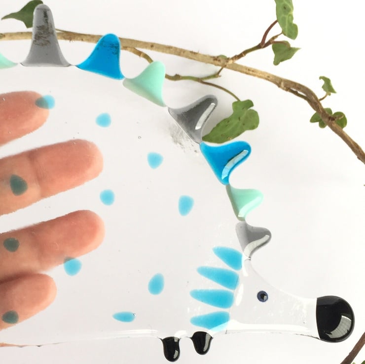 A wall mounted or hanging decorative fused glass hedgehog with grey, turquoise and blue spikes. It would look beautiful hung in a window or nailed to the wall in a bedroom or any other area of the home. It measures 18cm x 13cm.