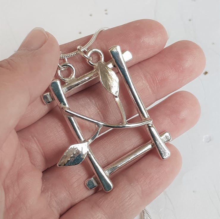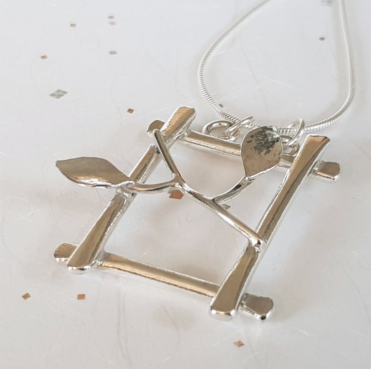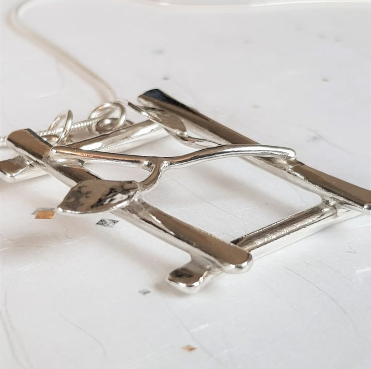 This is a beautiful statement necklace, inspired by the natural world, which features a branch with two leaves. It has been handcrafted from sterling silver, and as an original design is simply unique and stunning.