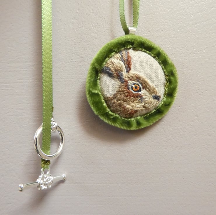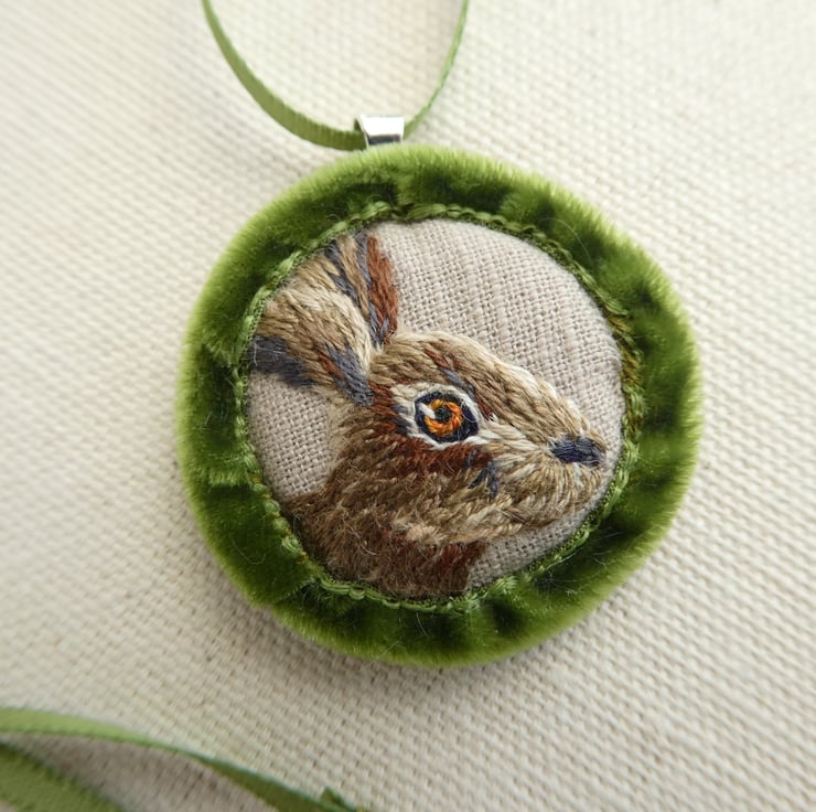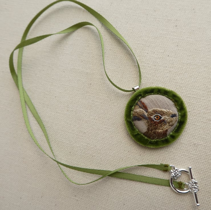 The hare is embroidered with strands of Anchor threads onto grey cotton and is edged with soft mossy green velvet ribbon. The pendant hangs from the ribbon through a silver plated hoop and there is a bar and circle to close the necklace, also silver plated. There is a penny coin between the fabric layers of the pendant to give it a little bit of weight.