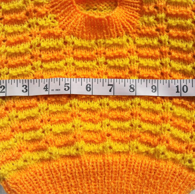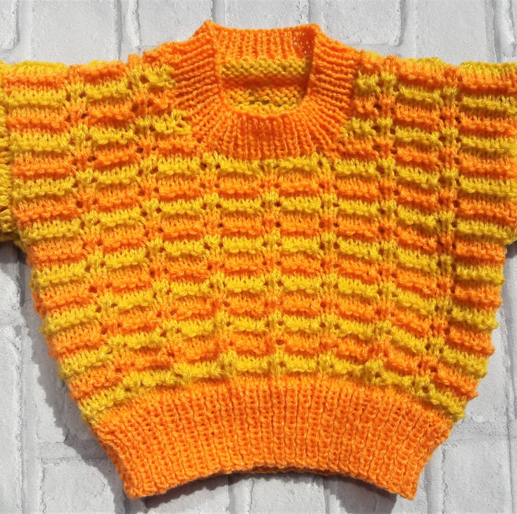 Sweater is orange and yellow, has a round collar and short sleeves.