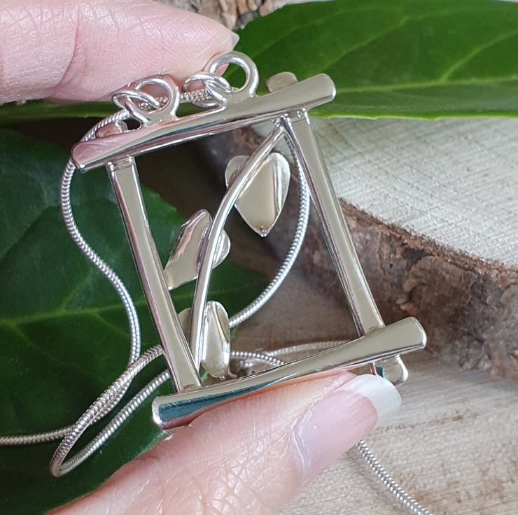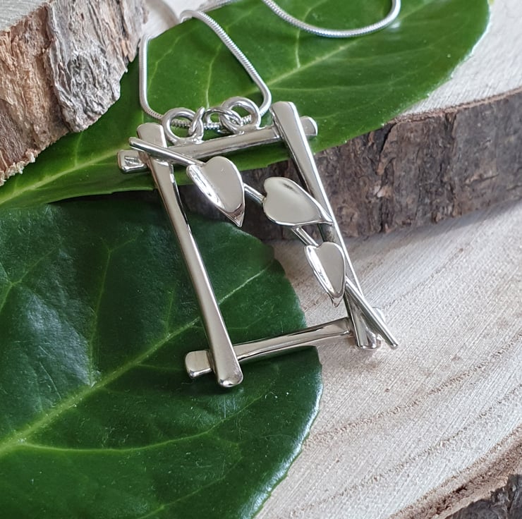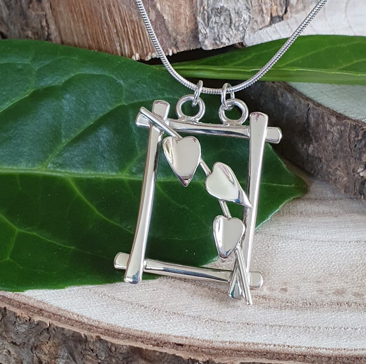 This gorgeous necklace is a true statement piece. The hand forged sterling silver frame is a happy home for the handcrafted three-leafed ivy vine, which is elegantly draped from top to bottom. It is simply stunning. This pendant is a truly unique and original design.