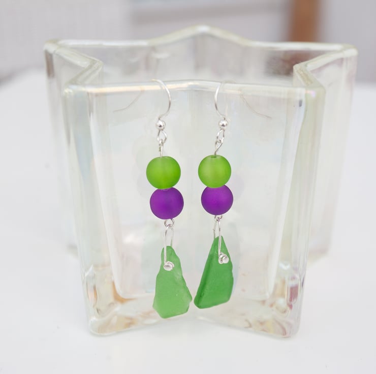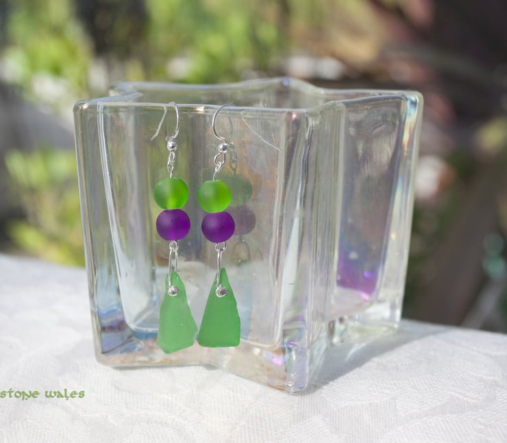 I've used two little triangular shaped pieces of sea glass found on the beach in wales and set them on sterling silver hooks, finished off with matching green and contrasting purple glass beads.