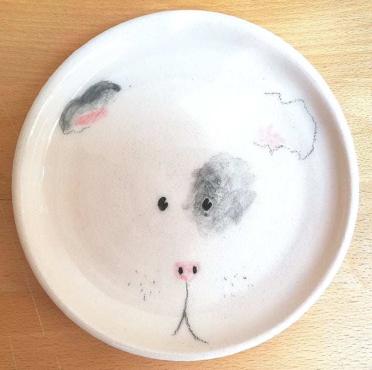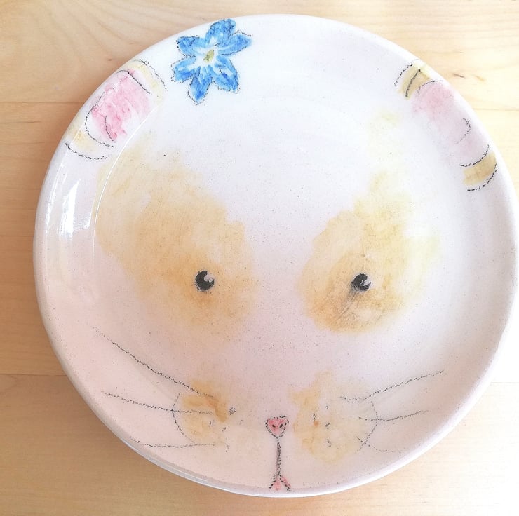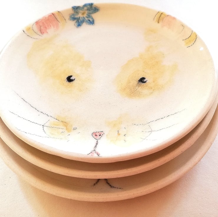 This little plate was hand painted with a little hamster or guinea pig face as an idea of nursery wall art. I also think they would be lovely as little cake plates. Each plate is painted individually so all have characters of their own which is my favourite reason for buying hand made :)