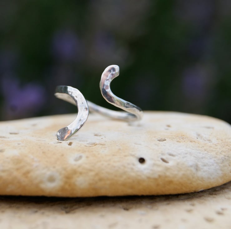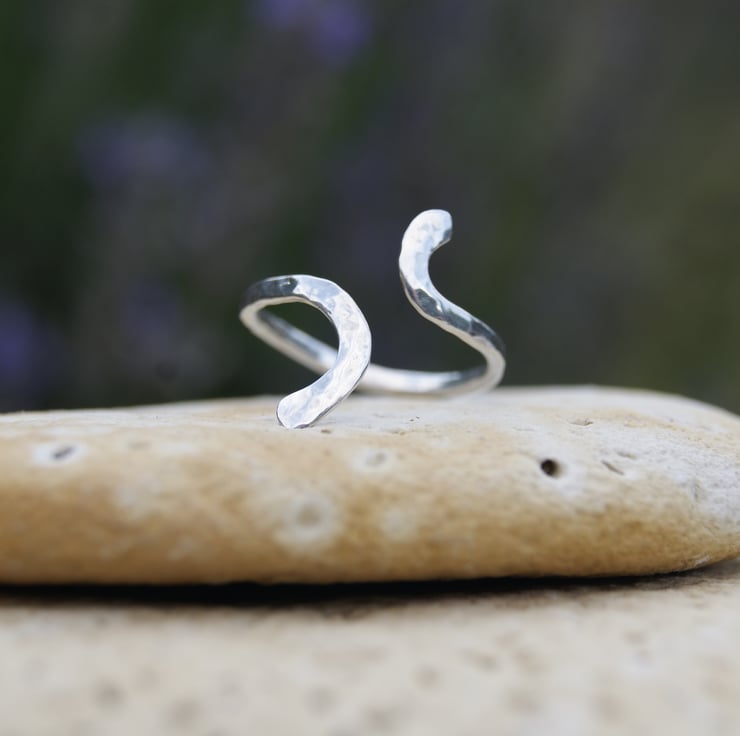 Once the ring has been formed to a basic shape the silver is hammered to give form and texture. Each open end graduates into an organic curve making the ring easy to wear.