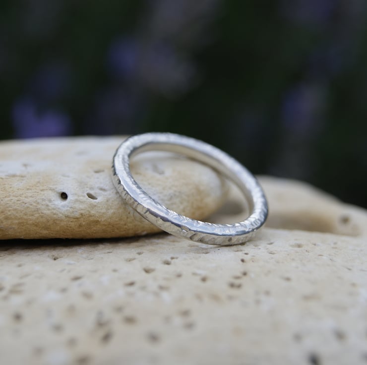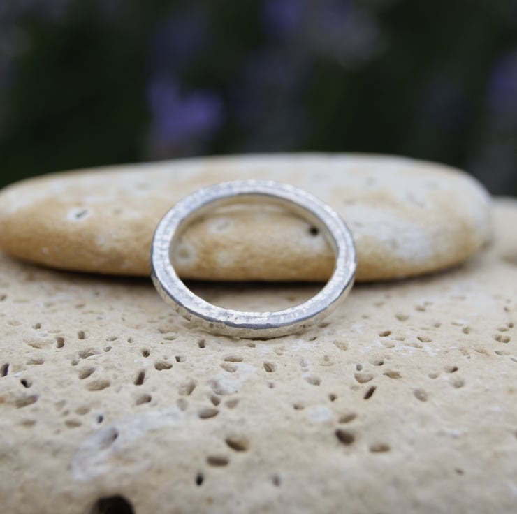 Sterling silver 3 mm diameter round wire is formed to a ring band; once soldered, cleaned and polished the surface is textured using my jewellers hammer producing a crosshatch effect.