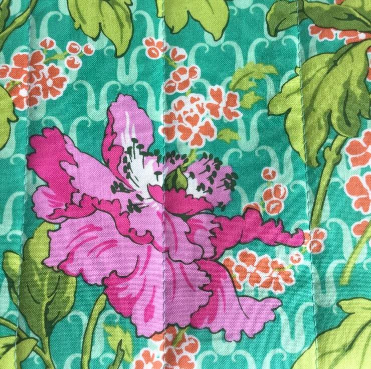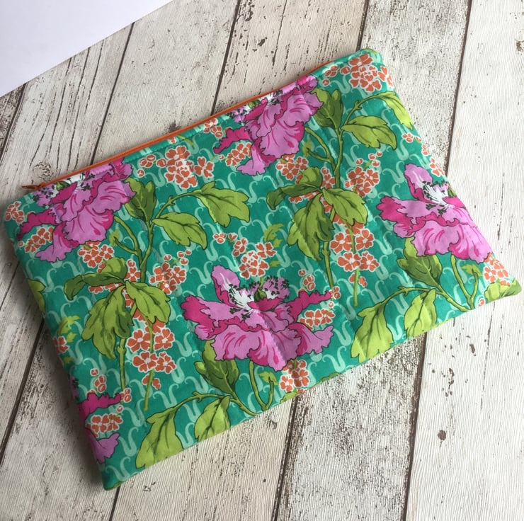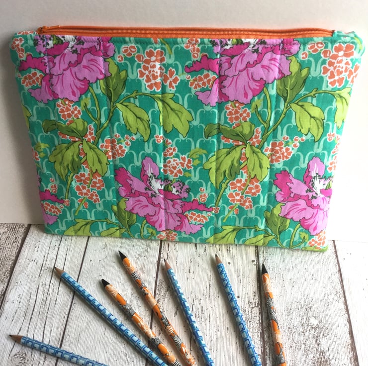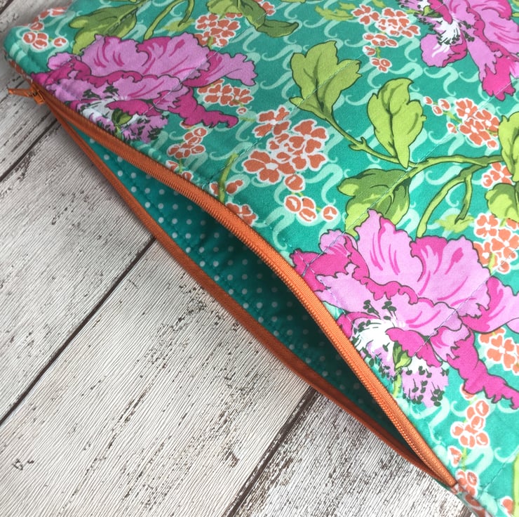 This beautiful cotton fabric with a turquoise background has a large poppy design in shades of pink with bright green foliage and orange background flowers. I have quilted the bag in a shade of thread to match the backing colour and used an orange all purpose nylon zip to compliment the bag.