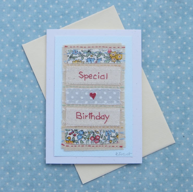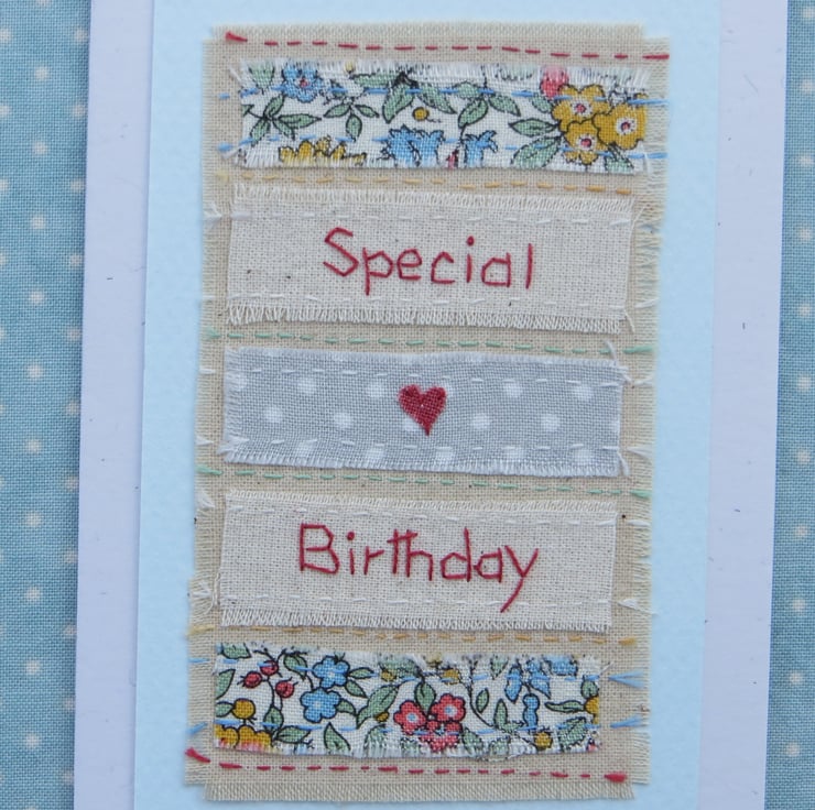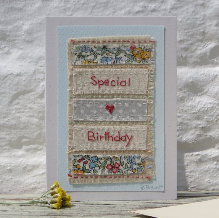 For this card I have embroidered the words 'Special Birthday' adding pretty Liberty fabrics and a tiny applique heart, everything stitched into place by hand. I have left the raw edges and thread ends showing to give the miniature textile a 'homespun/homemade' feel.