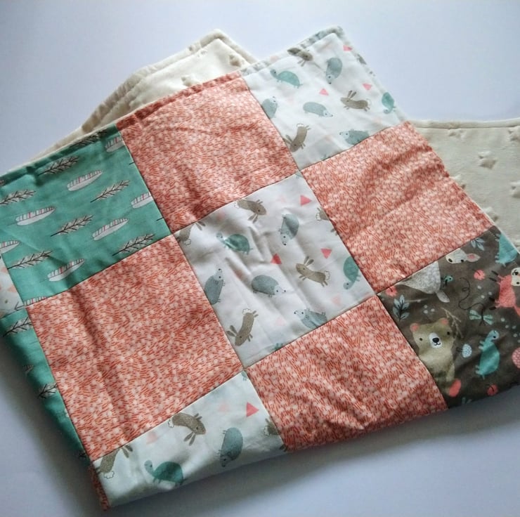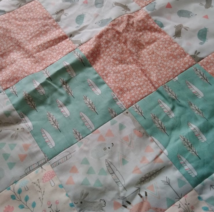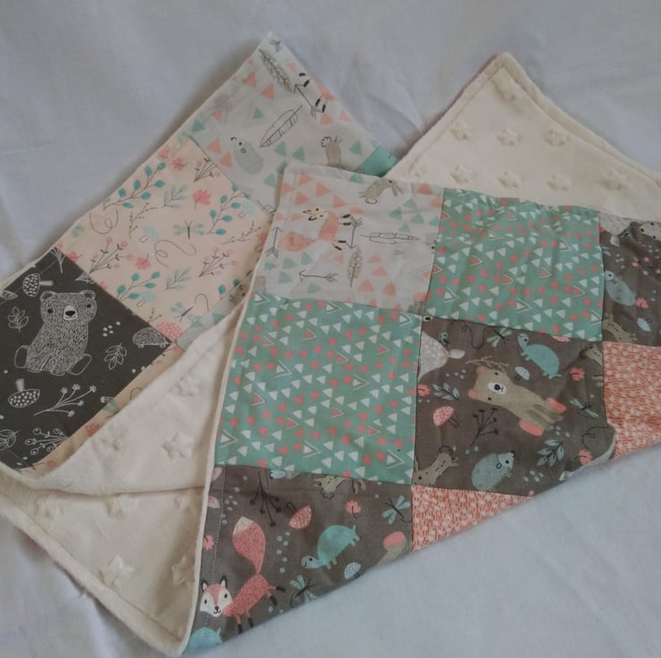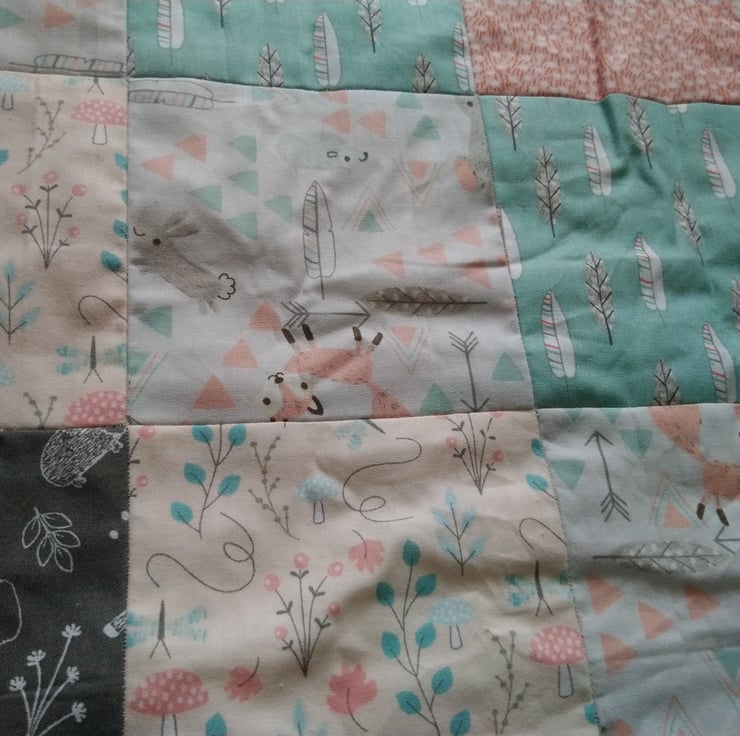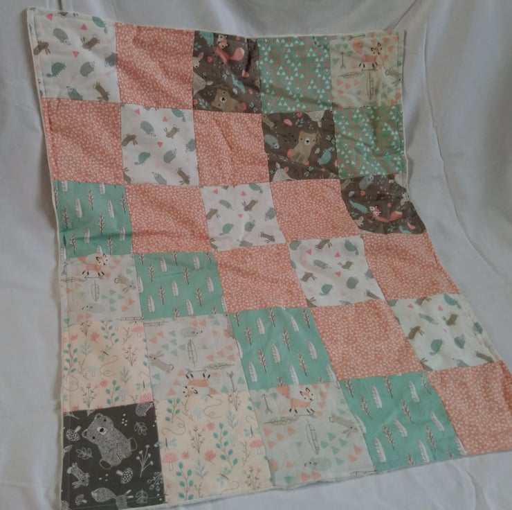This is a handmade baby patchwork blanket with a design featuring woodland animals. The blanket is also made from a variety of matching cotton fabrics.