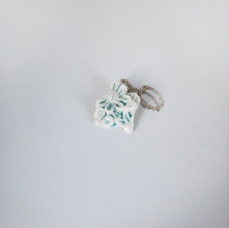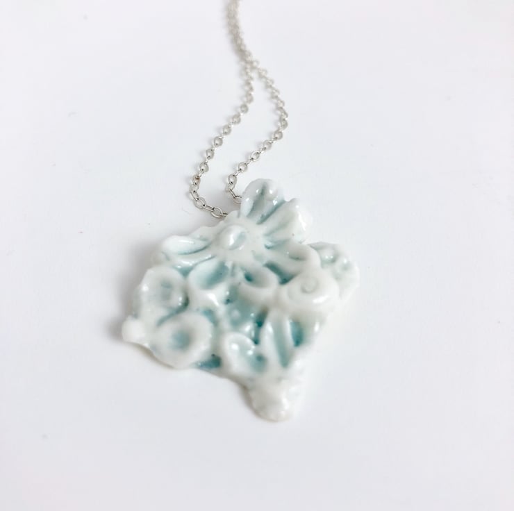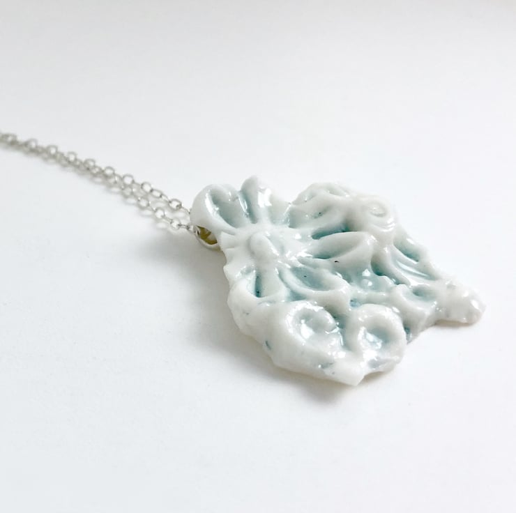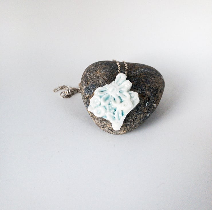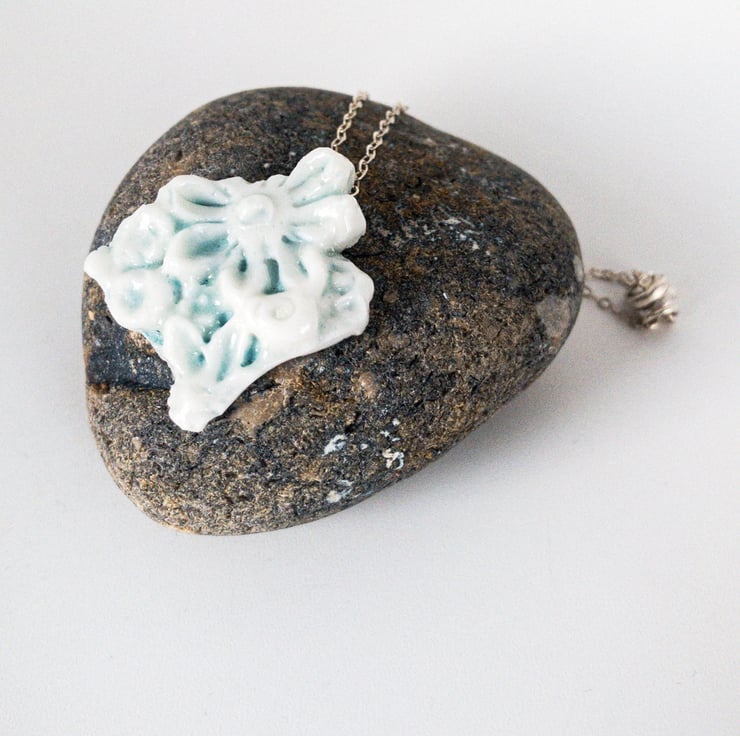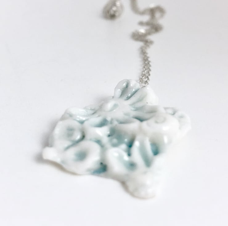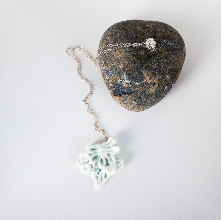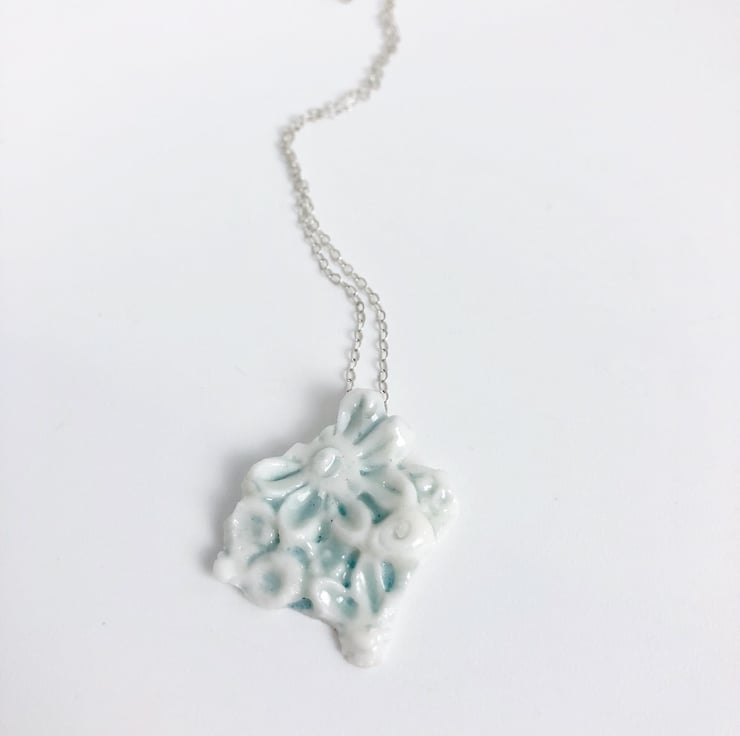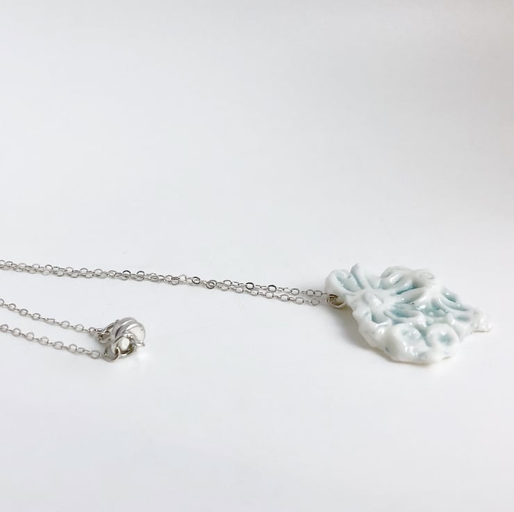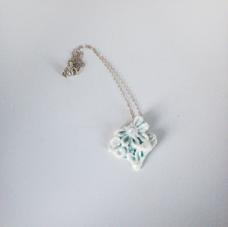 A porcelain flower fragment necklace with a sterling silver fine trace chain.