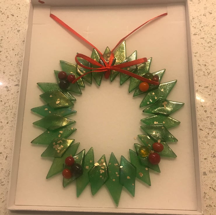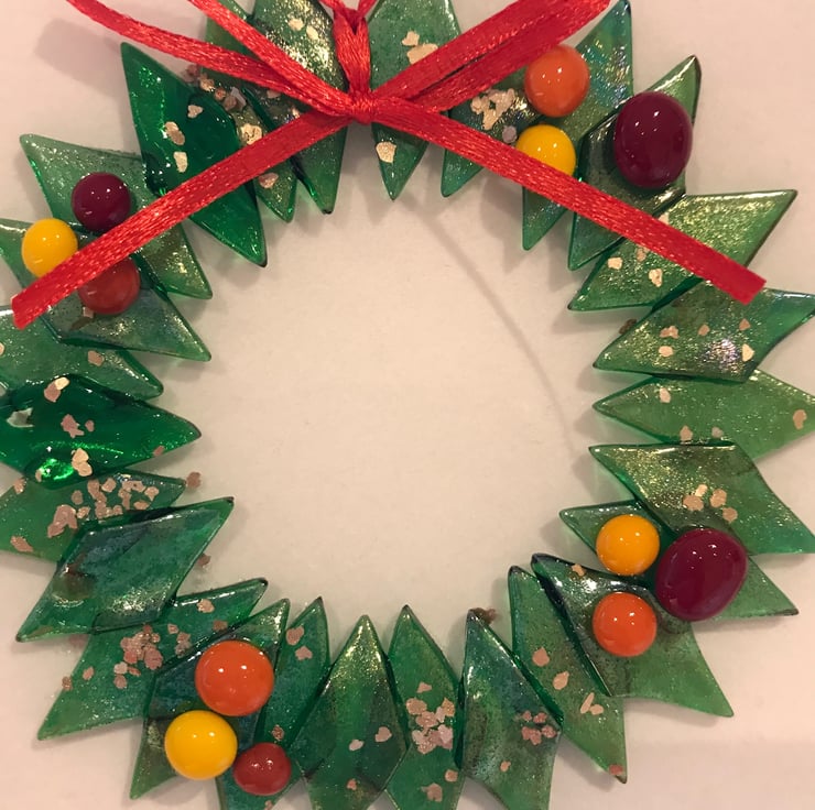 Approximately 5-6 inch diameter these beautiful hand made fused glass wreaths are made from different greens with red berries and red ribbon attached . The glass has a luminescent quality which has a gold hint . They look beautiful hung on a mirror or a fireplace but also as the come in a white gift box they are also an ideal gift . Each is different , some have gold glitter - please specify .