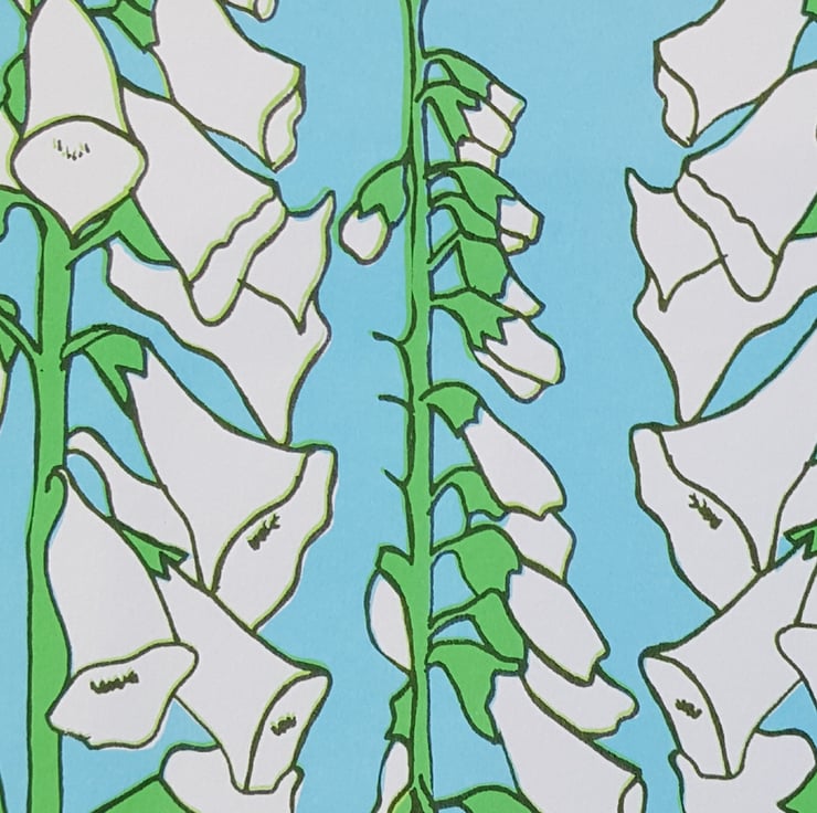 Foxglove hand screen printed card, designed and screen printed in hand mixed colours in my garden studio in Suffolk. The Foxglove design is had drawn from Foxgloves growing in my Suffolk garden.