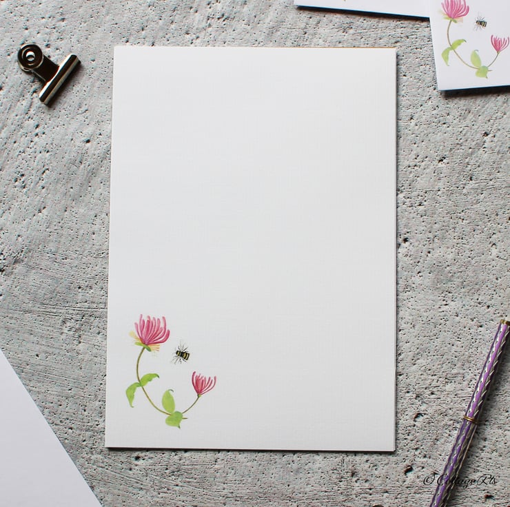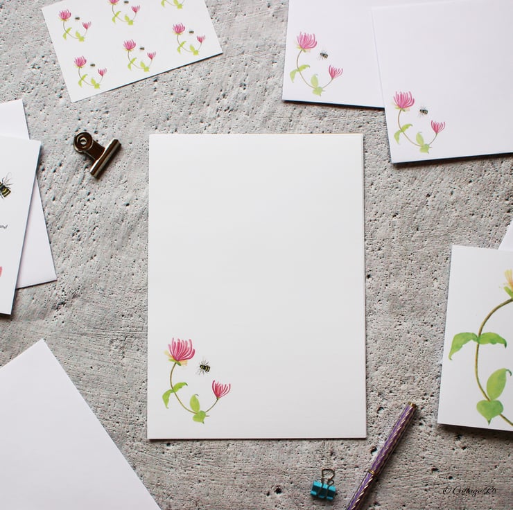 - 6 sheets A5 100gsm laid letter writing paper with the Honeysuckle and Bee printed in the bottom left hand corner.