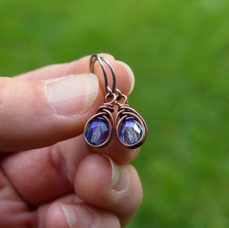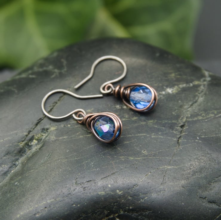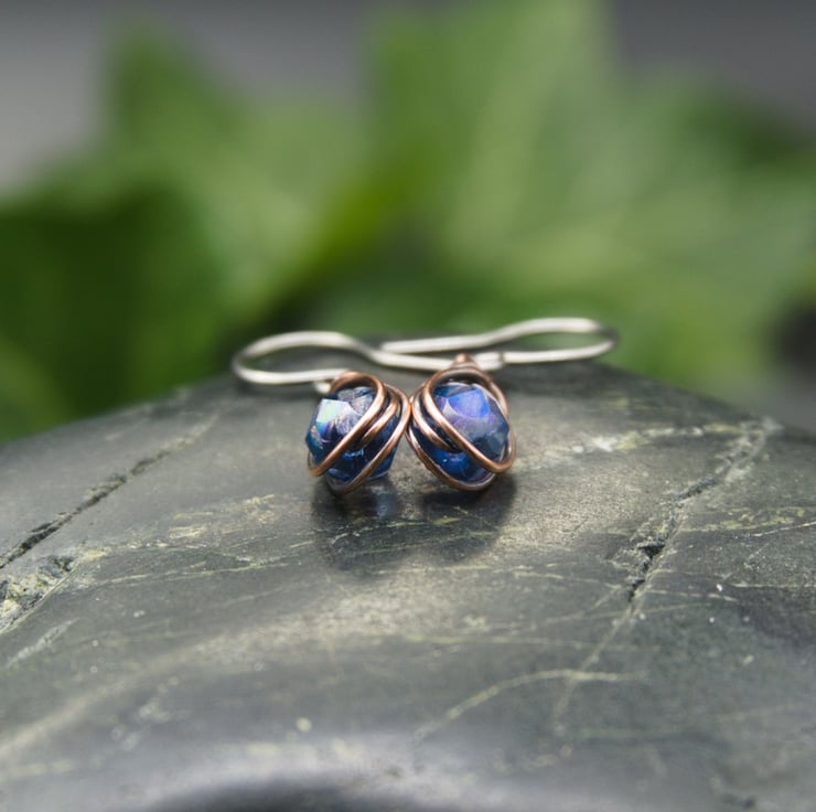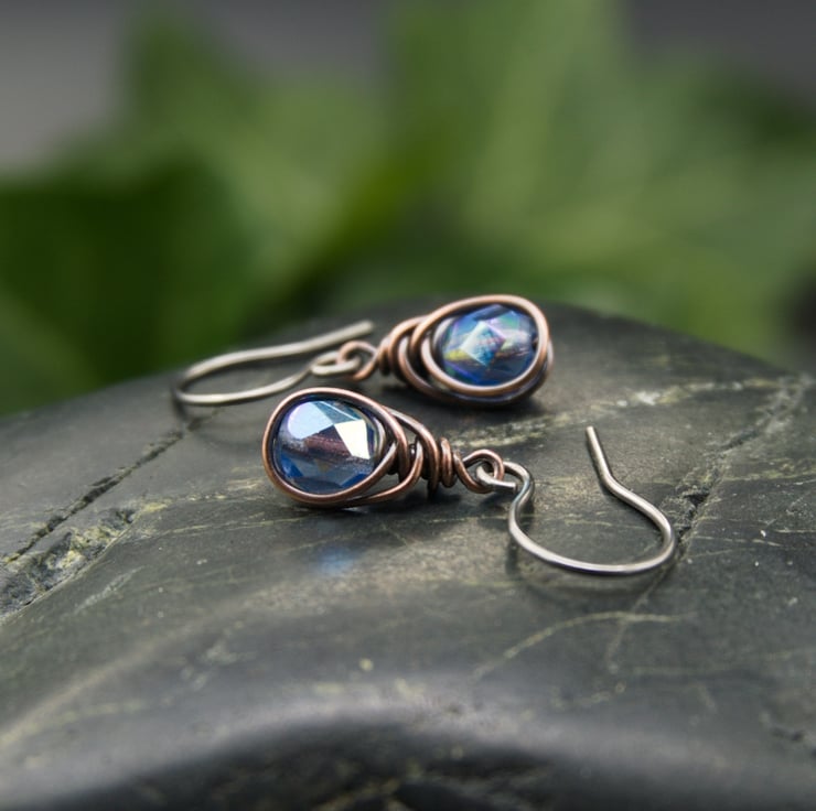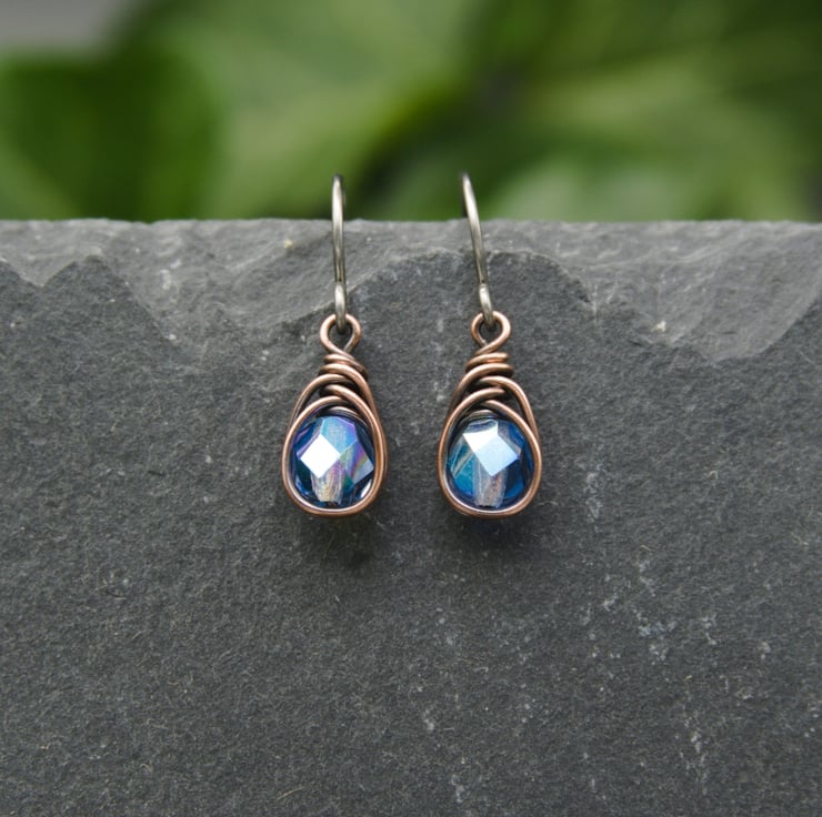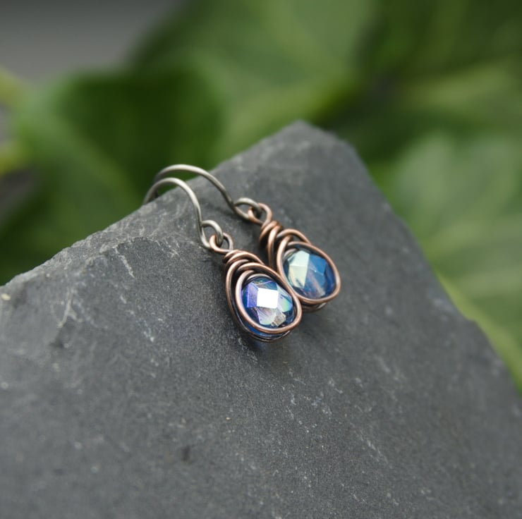 These pretty little earrings feature 6mm faceted glass beads in a pale blue colour, which I have wrapped with copper wire using a herringbone weave. The beads have an 'AB' finish - AB actually stands for Aurora Borealis as the finish adds a prismatic effect giving a beautiful shimmer, much like the Northern Lights! This mirrored finish looks fantastic with the copper & makes these a stunning pair of earrings, suitable for everyday or a special occasion.