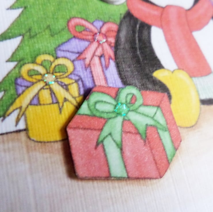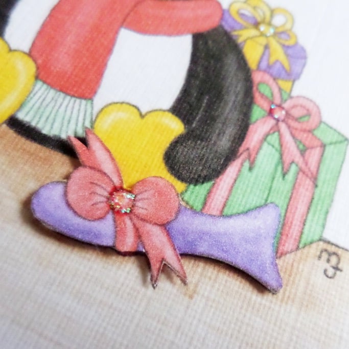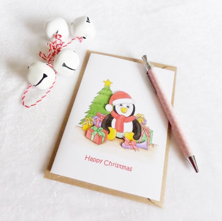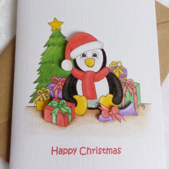 This cute Christmas Penguin card has been designed using my own original watercolour illustration. The card has been printed out onto good quality linen embossed card. The little decoupaged Christmas pressies and Santa's hat have been cut out by hand and finished off with a little glitter detail.