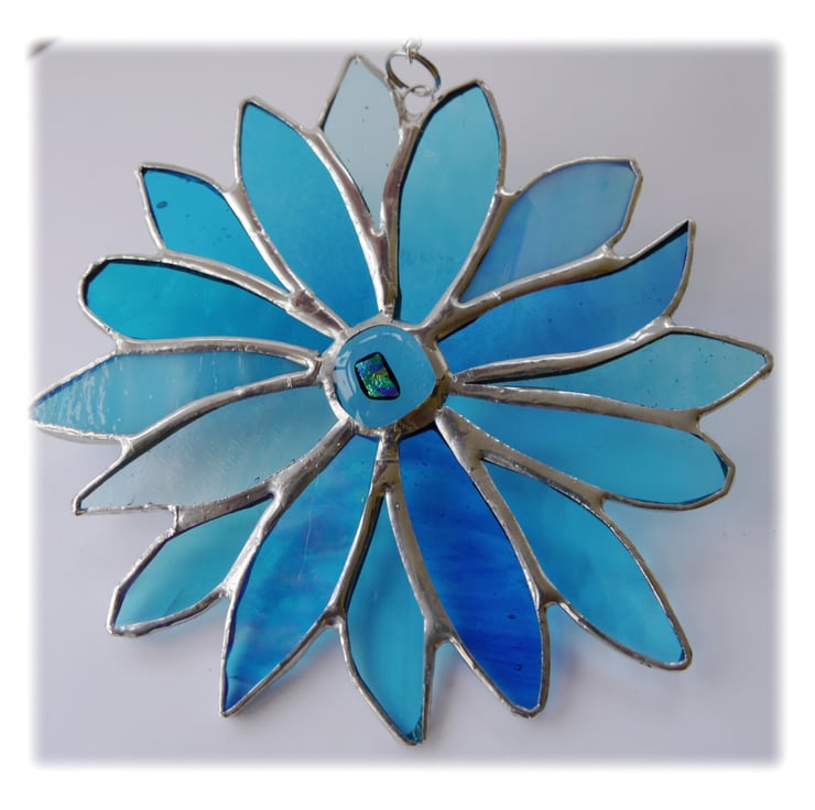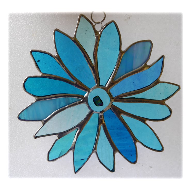 The flower has 16 petals, all slightly different shapes. In the centre is a turquoise dichroic glass nugget I fused in my kiln.