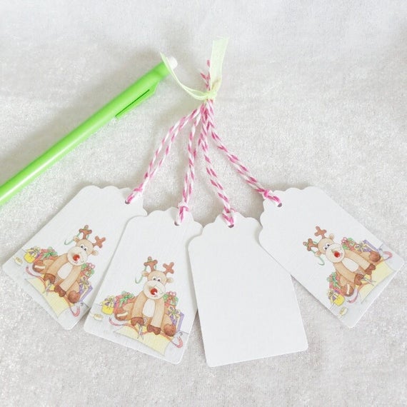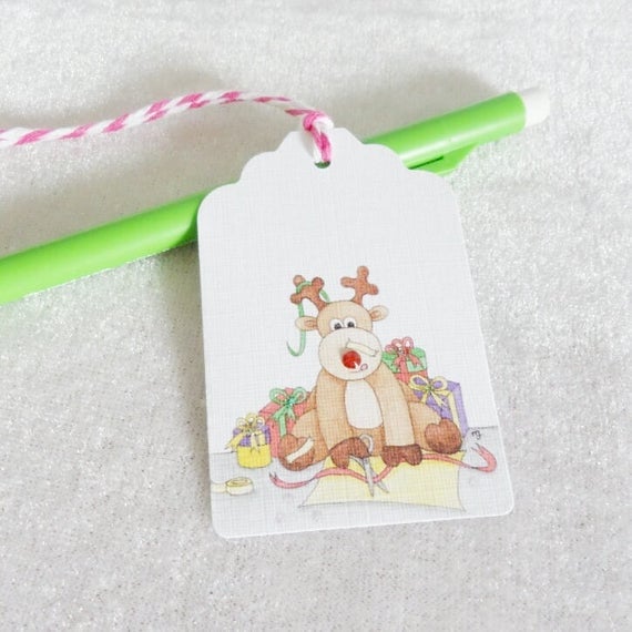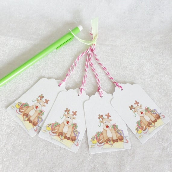 Each tag has been printed out onto good quality white linen embossed card and has a Christmassy candy cane red and white coloured twine attached. I have added a little glitter detail and Rudolph has a shiny red gem nose. Each tag is blank on the reverse for you to write your own message.
