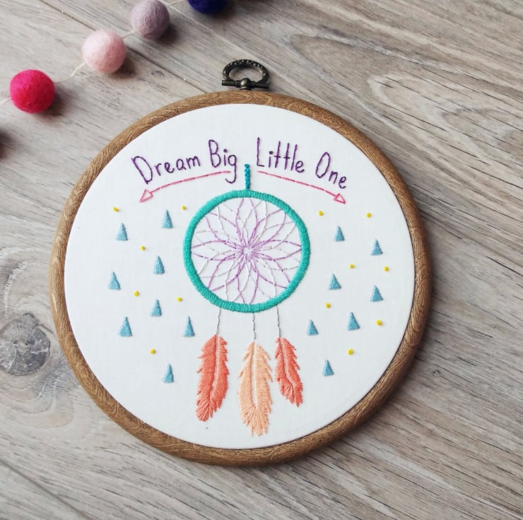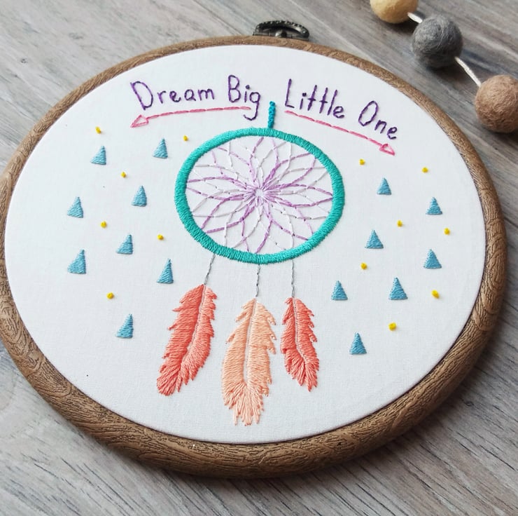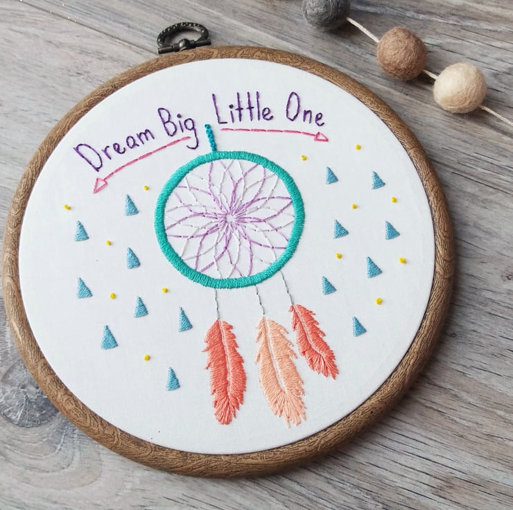 A gorgeous 'Dream Big Little One' dreamcatcher hoop with a boho/Scandi theme. It features a beautiful dreamcatcher with feathers in orange and teal, triangles and arrows and is set in a six inch embroidery hoop. Perfect as a baby gift or decor for any nursery.