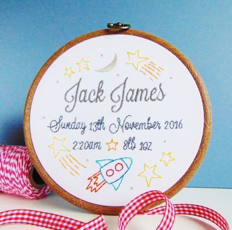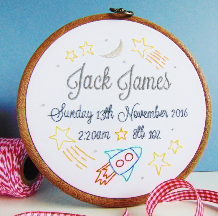 Are you looking for a special gift for a baby boy or child who loves space and rockets? My original Space and Stars themed hoop features a rocket, stars, moon and can be personalised with ANY wording in the middle. Ideal for a boys Christening, 1st Birthday or any other occasion. Hand sewn onto white cotton and set in a six inch embroidery hoop.