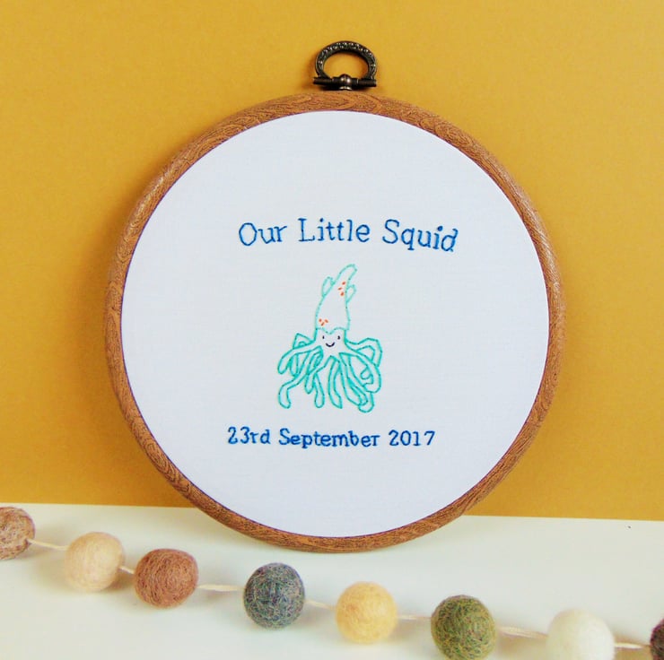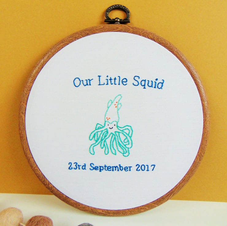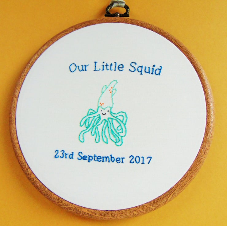 This adorable baby squid is entirely hand stitched and can be personalised with any wording above and below. Perhaps a name, other wording, date etc and I can stitch the entire hoop in any colour scheme. It is sewn to order onto white cotton and set in a six inch embroidery hoop. Perfect as a gift for a new baby, boy or girl or even as a baby shower gift.