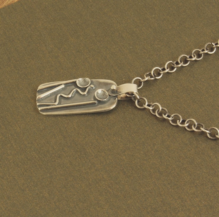 A unique and exciting designer silver pendant of a modernist, abstract style featuring images inspired by wild flowers on a far off prairie grassland. The effect is composed of various textured surfaces and soldered silver shapes and lines. All the metal used is sterling silver of a premium quality. The accompanying chain is also hand-crafted, by myself.