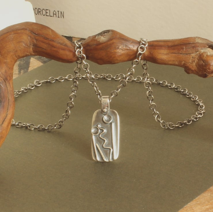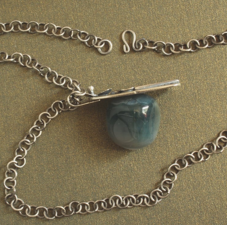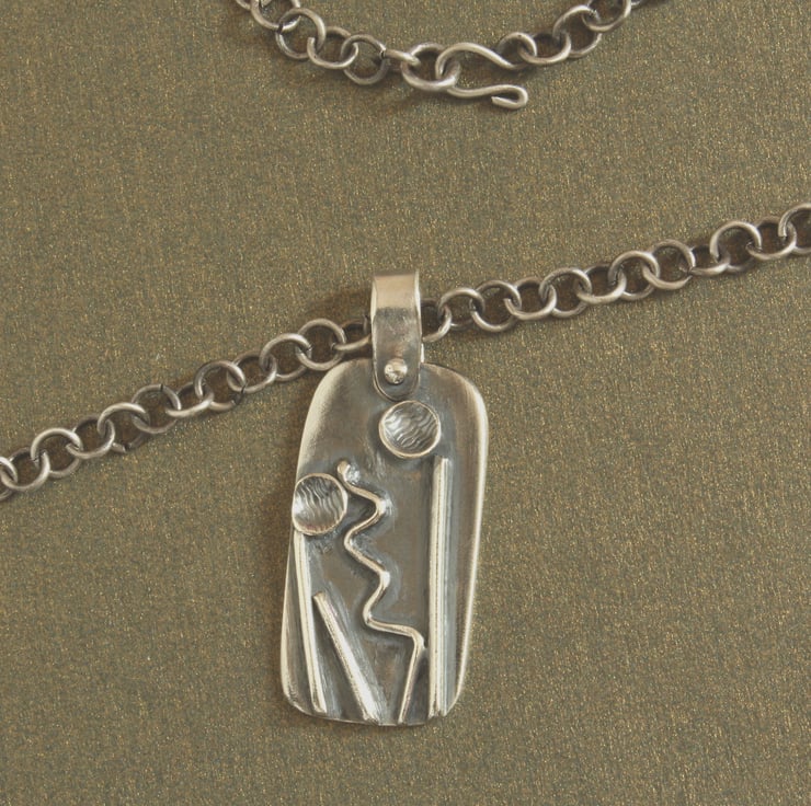 Technically speaking the pendant is 4.5cm, top to toe and nearly 2cm wide. It is a fine weight to wear, a sophisticated piece and weighs 23gm, chain included. The chain is composed of simple links of darkened silver and closes with a hook, it is 56cm (22") long.