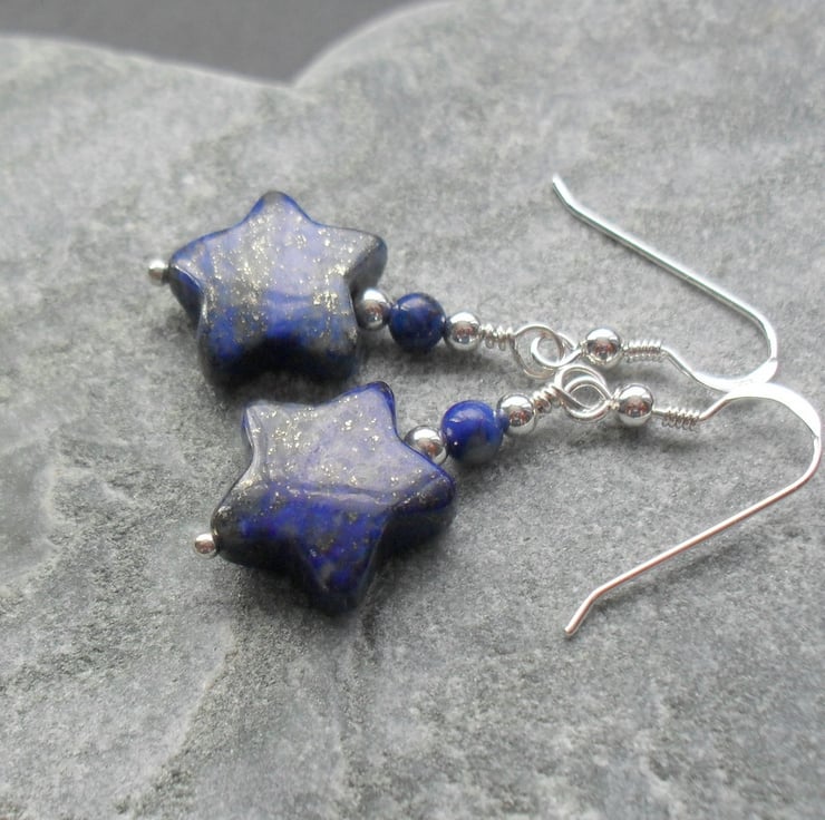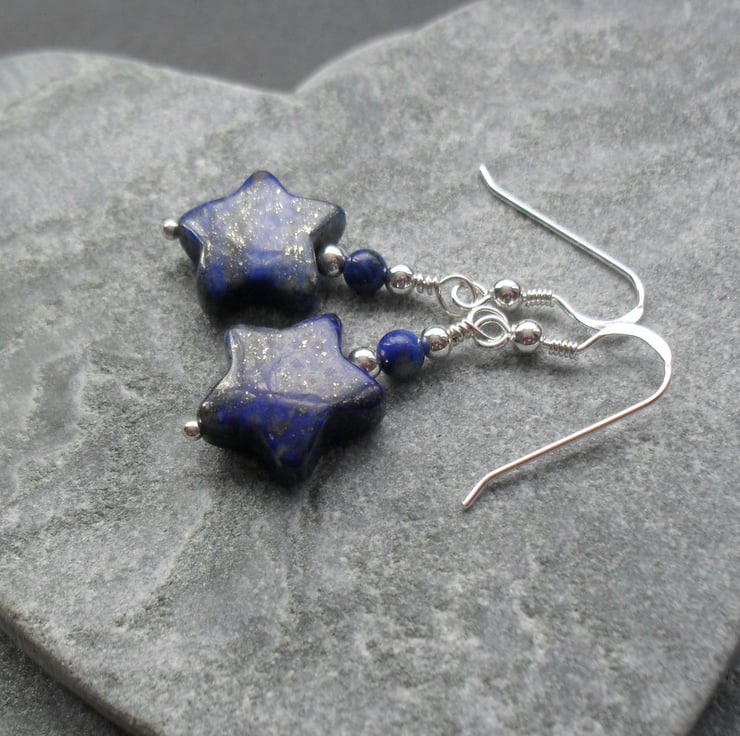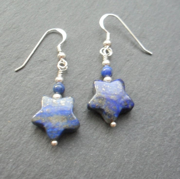 Natural Lapis lazuli stars with lovely inclusions of pyrite semi precious gemstones and sterling silver beads are attached to sterling silver ear wires