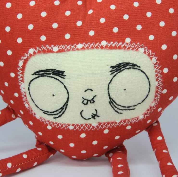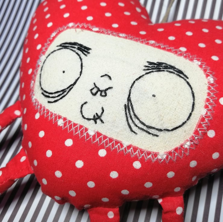 Meet Goofy Love. This heart has a twine hanger, mismatched arms and legs that dangle and a hand embroidered face in black thread. He's quirky and wonky but full of fluff, lavender and love. A creepy cute token of love for those who like things a bit different.