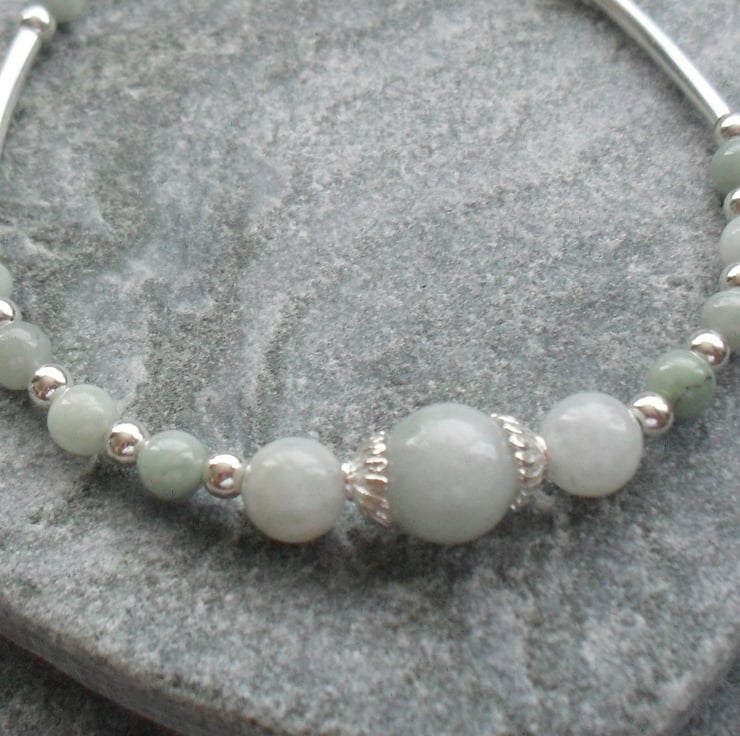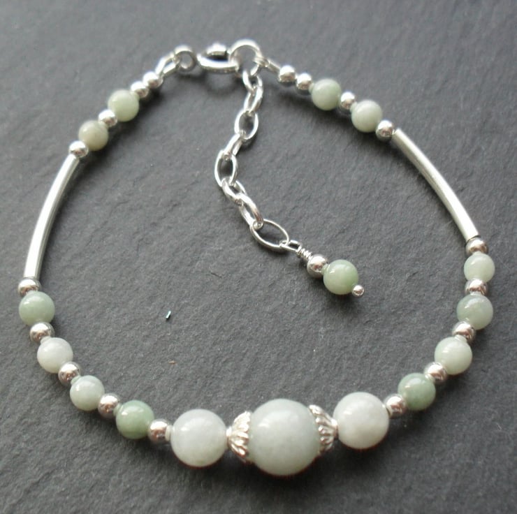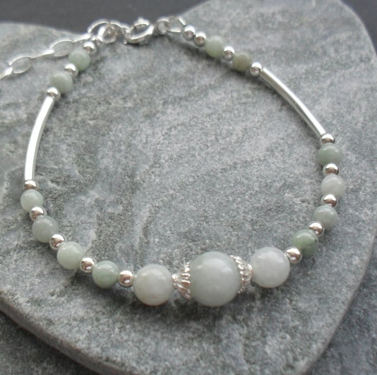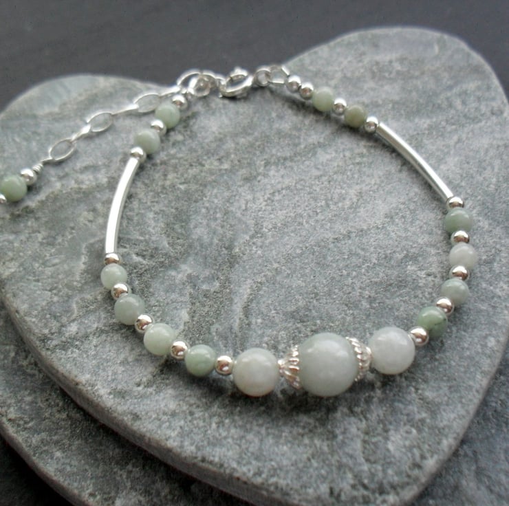 Burmese jadeite with sterling silver spacer bars and beads make up this lovely bracelet.