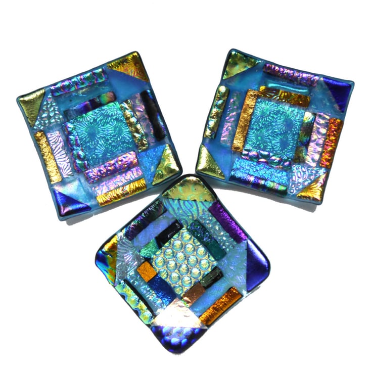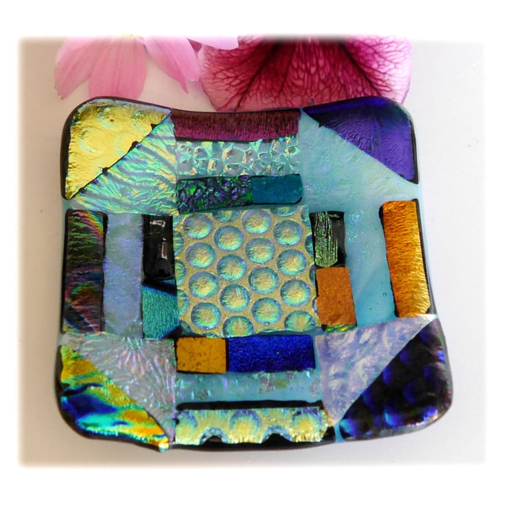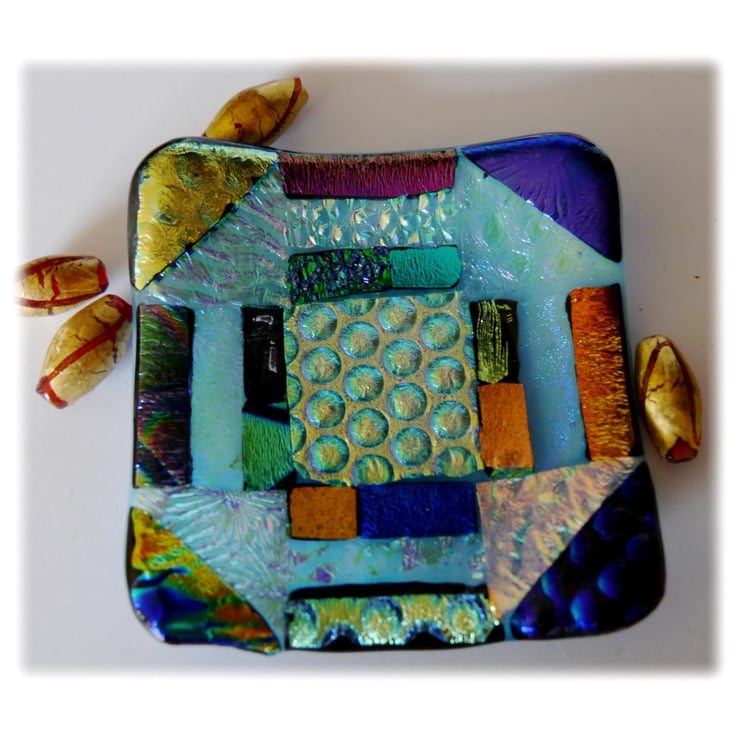 I've used a streaky pale turquoise glass for the base then covered it with precious dichroic glass in a Patchwork design. Some dichroic is black backed and some transparent so the light shines through.